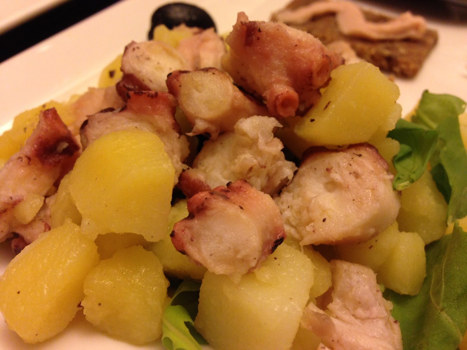 Cuoci il polipo ancora congelato in acqua per circa 40 minuti. Levalo dal fuoco, lascialo raffreddare nella sua acqua. Puliscilo un po’ dalla pelle e taglialo a pezzetti. Pela le patate, tagliale a cubetti. Fai cuocere le patate al vapore al microonde con l’apposita pentolina per 10 minuti circa a 700 Watt. Metti il polipo e le patate in una ciotola, aggiungi le olive, l’olio, il sale e poco aceto di vino. Metti in piatto con sotto un po’ di rucola.