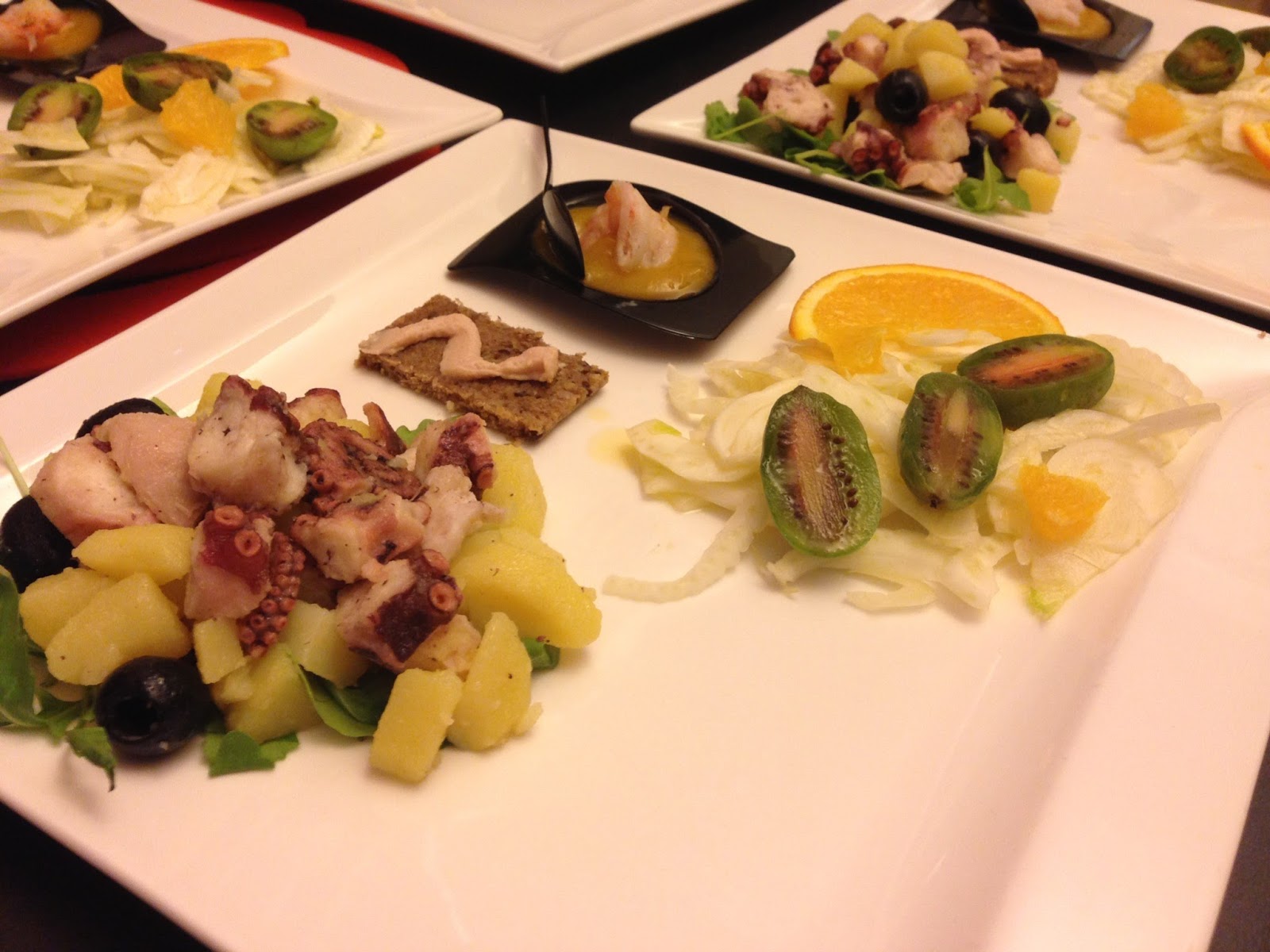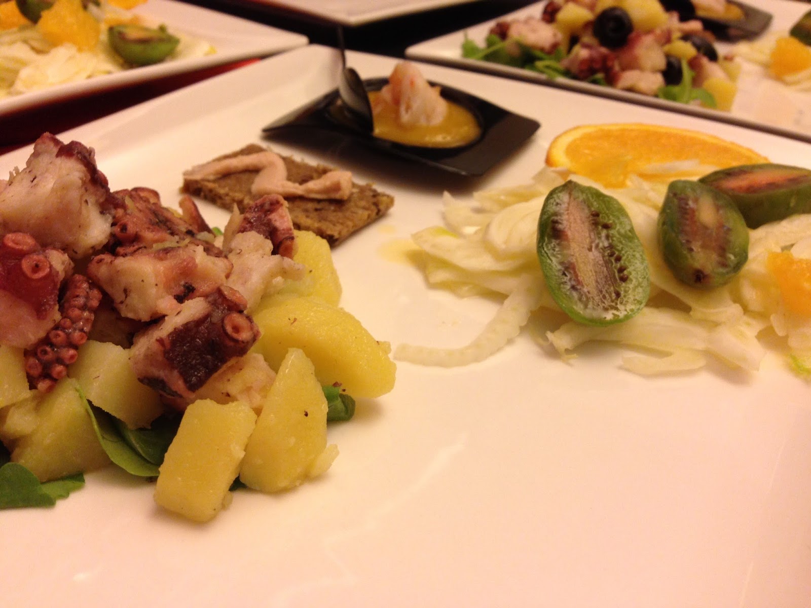 Nergi (io ho utilizzato i NERGI di NERGFOOD – SOFRUILEG), 1 finocchio crudo, 1 arancia, code di mazzancolle, pane ai semi di lino (io ho utilizzato il PEMA Biologico – Cestino 4 Tipi Integrali Bio di PEMA Vollkorn-Spezialitäten Heinrich Leupoldt KG), paté di tonno, 1 polpo da 1 kg circa, patate 400 gr circa, rucola, olive nere denocciolate. olio, sale, aceto di vino.