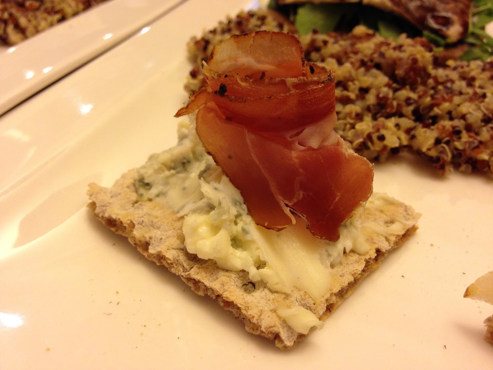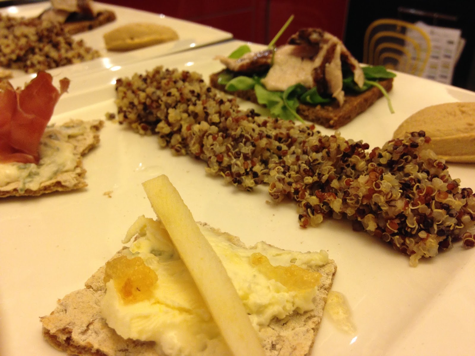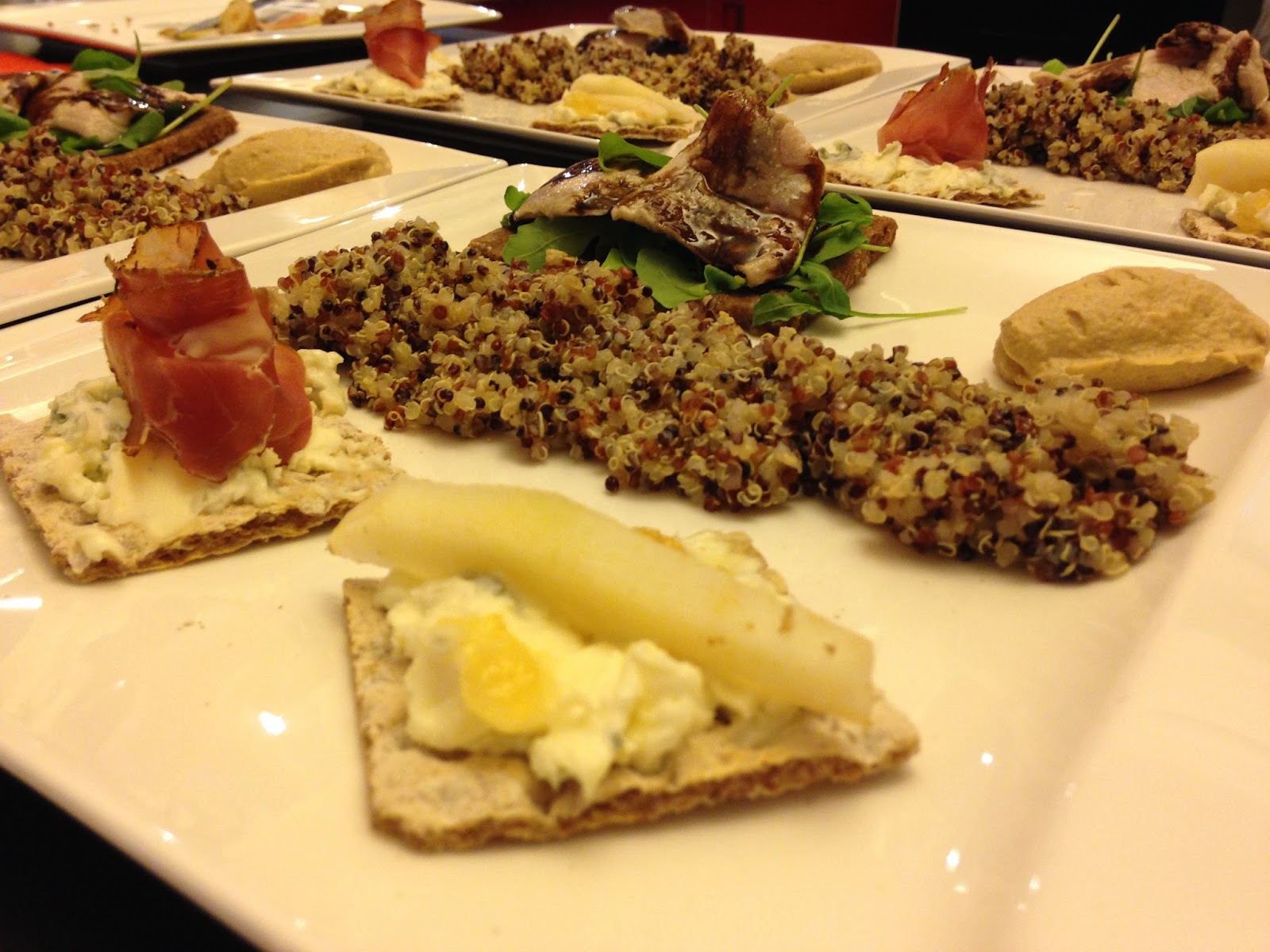 Quinoa rossa, nera e bianca, code di gambero o mazzancolle, pomodorini, miele, cracker, pane di segale integrale (io ho utilizzato PEMA Classico – Di Segale Integrale di PEMA Vollkorn-Spezialitäten Heinrich Leupoldt KG), filetti di cefalo sott’olio, rucola, salsa di aceto balsamico, gorgonzola con mascarpone, speck, pera, mostarda di pere, Hummus.