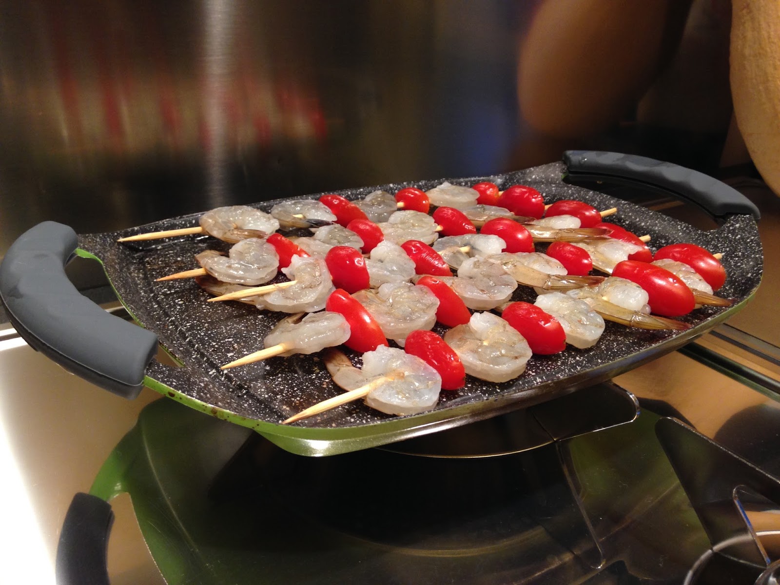 Cuocete la quinoa dopo averla ben lavata per il tempo scritto sulla confezione, 20 minuti circa. Metteteci un po’ di olio e Shoyu sopra. Pulite e togliete il guscio ai gamberi e l’intestino, lasciando solo la cosa. Formate gli spiedini con i pomodorini ed i gamberi. Cuocete gli spiedini di gamberi e pomodorini con un po’ di miele sopra. Mettete in piatto sopra alla quinoa rossa, nera e bianca.