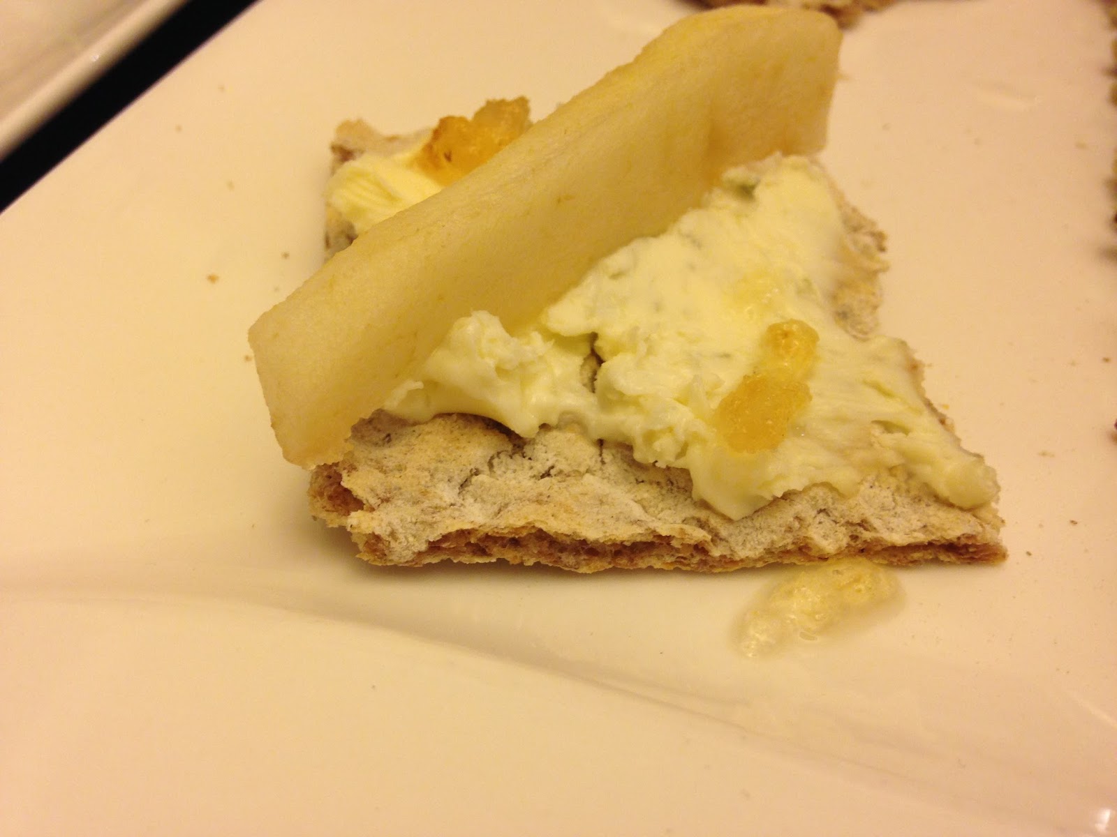 Prendete i crackers integrali, spalmateli con il gorgonzola con mascarpone. Mettete un po’ di mostarda alle per ed una fettina di pera. Mettete in piatto.