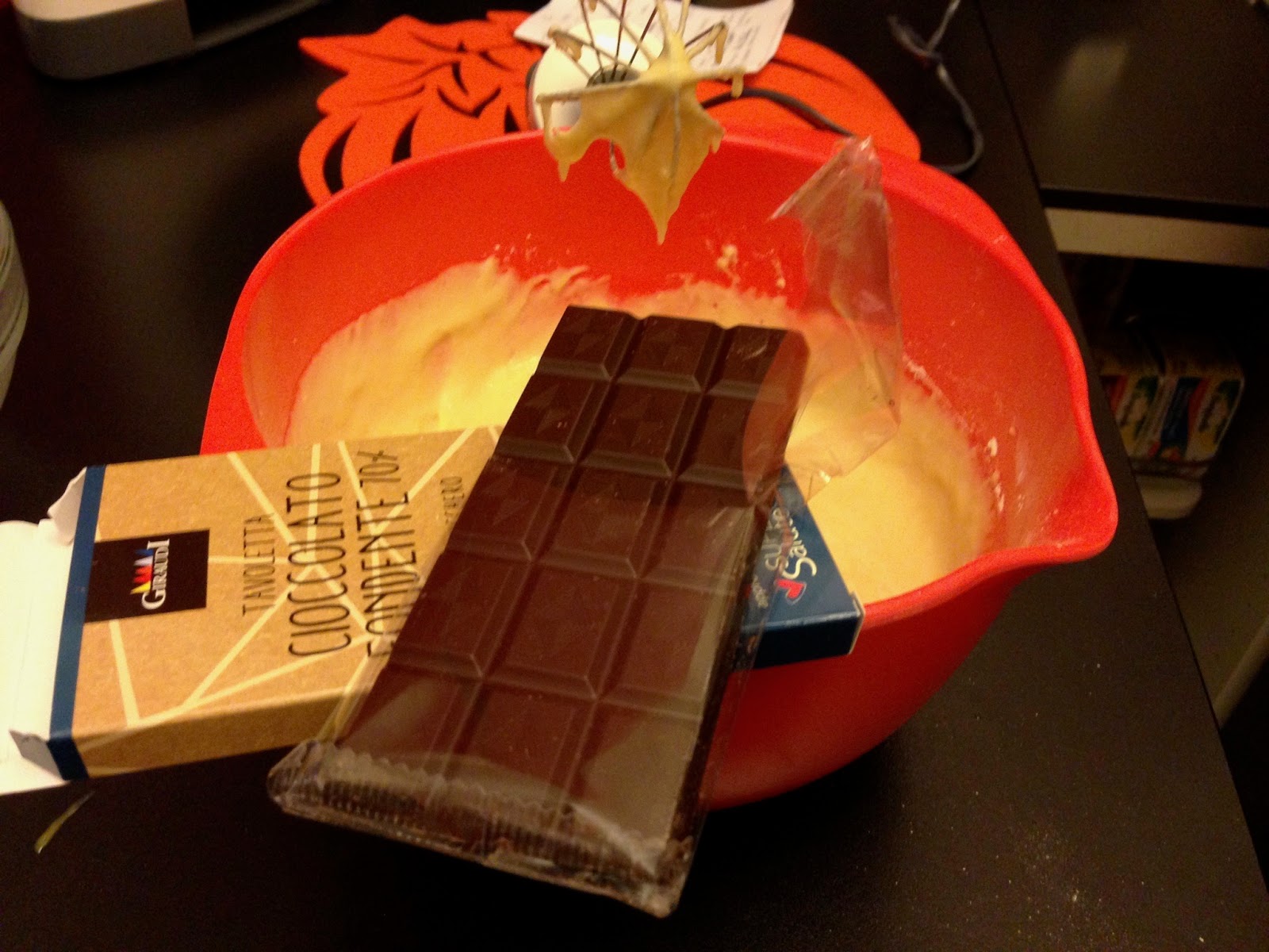 Tritate il cioccolato e versatelo nell’impasto mescolando bene per amalgamarlo uniformemente.