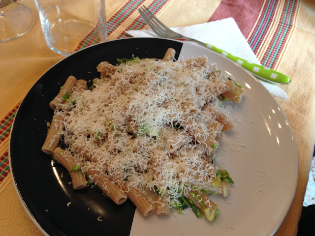 Fusilli semiintegrali al farro, zucchine julienne, ceci, poco olio di oliva, sale q. b., grana o parmigiano a piacere, Shoyu.