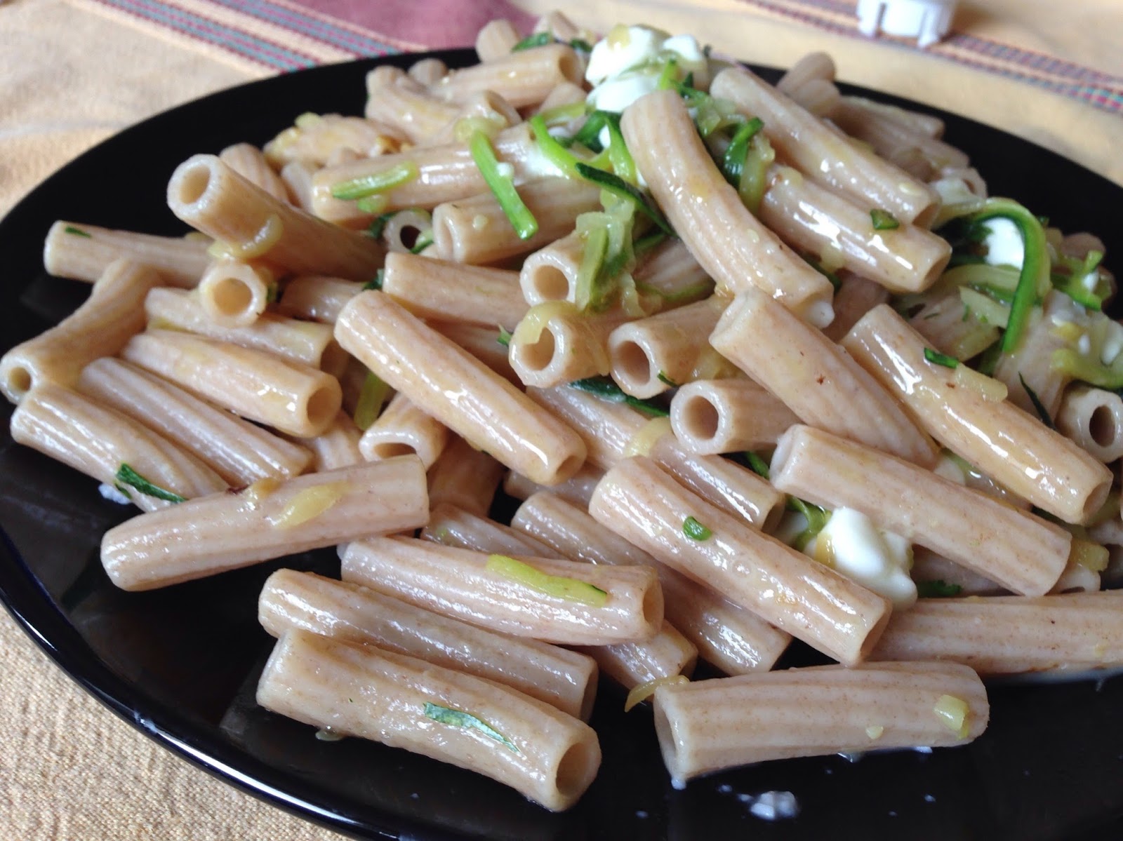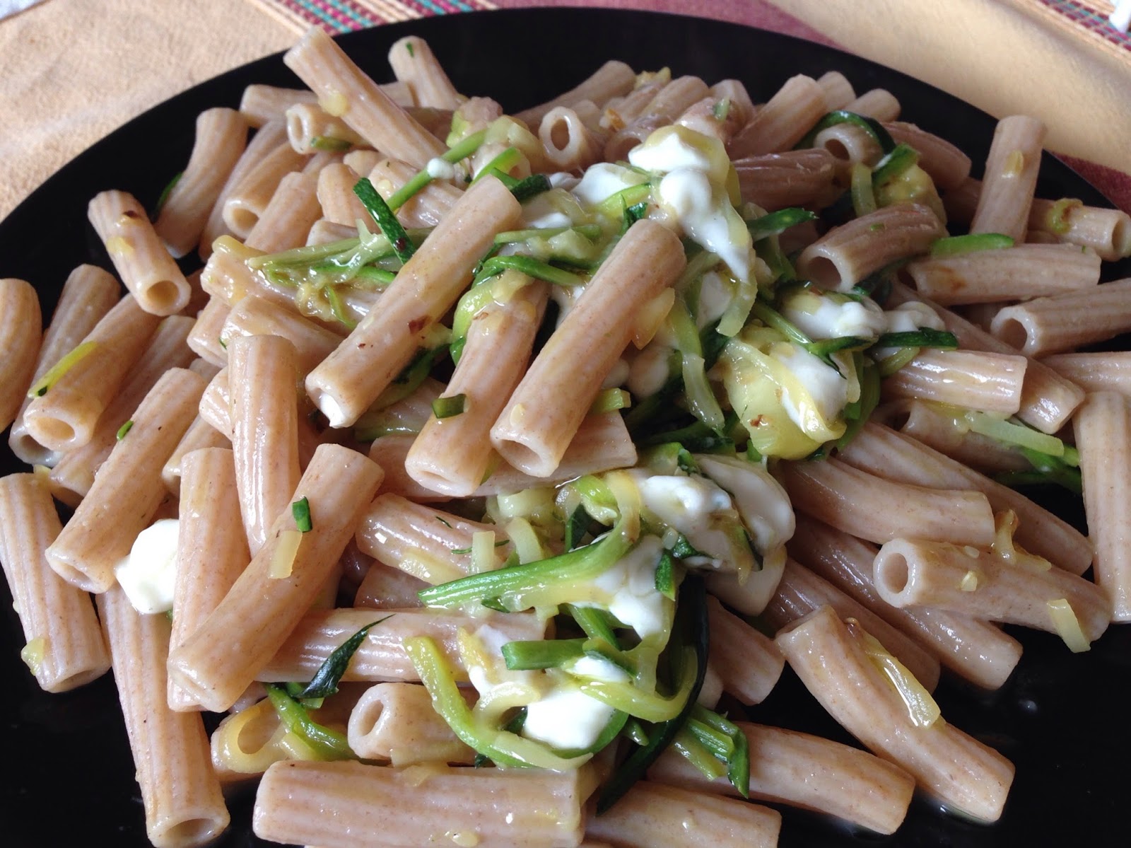 Fusilli semiintegrali al farro, zucchine julienne, stracchino, poco olio di oliva, sale q. b., grana o parmigiano a piacere, Shoyu.