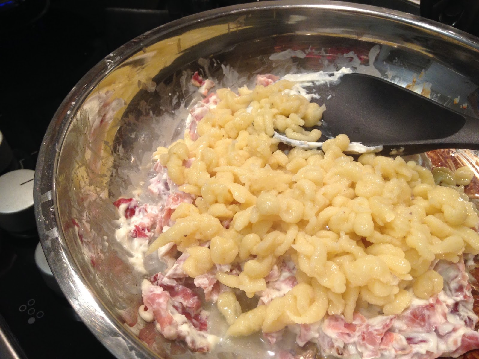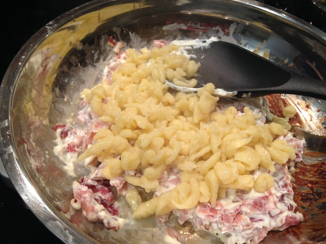 Tagliare lo speck a cubetti o a fogliettine, come preferite, mettete un bel po’ di Philadelphia. Condite gli spatzle metà con questo sugo.