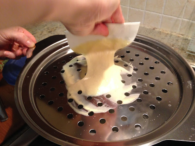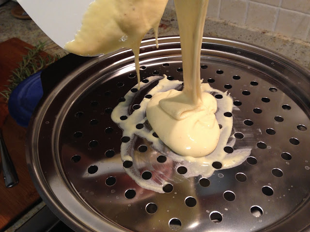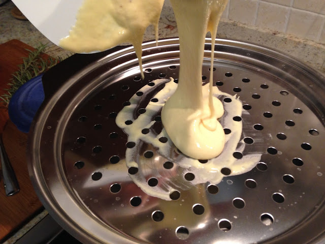 Far bollire dell’acqua salata. Mettere sopra la pentola dell’acqua la grattugia apposita per spatzle (in mancanza di quella, potete utilizzare la grattugia per il formaggio). Mettete un po’ di impasto alla volta e, man mano, con l’apposito raschietto, far scendere l’impasto nell’acqua bollente. Come per gli gnocchi, man mano che gli spatzle vengono a galla, prenderli con lo scolino e metterli nel sugo.