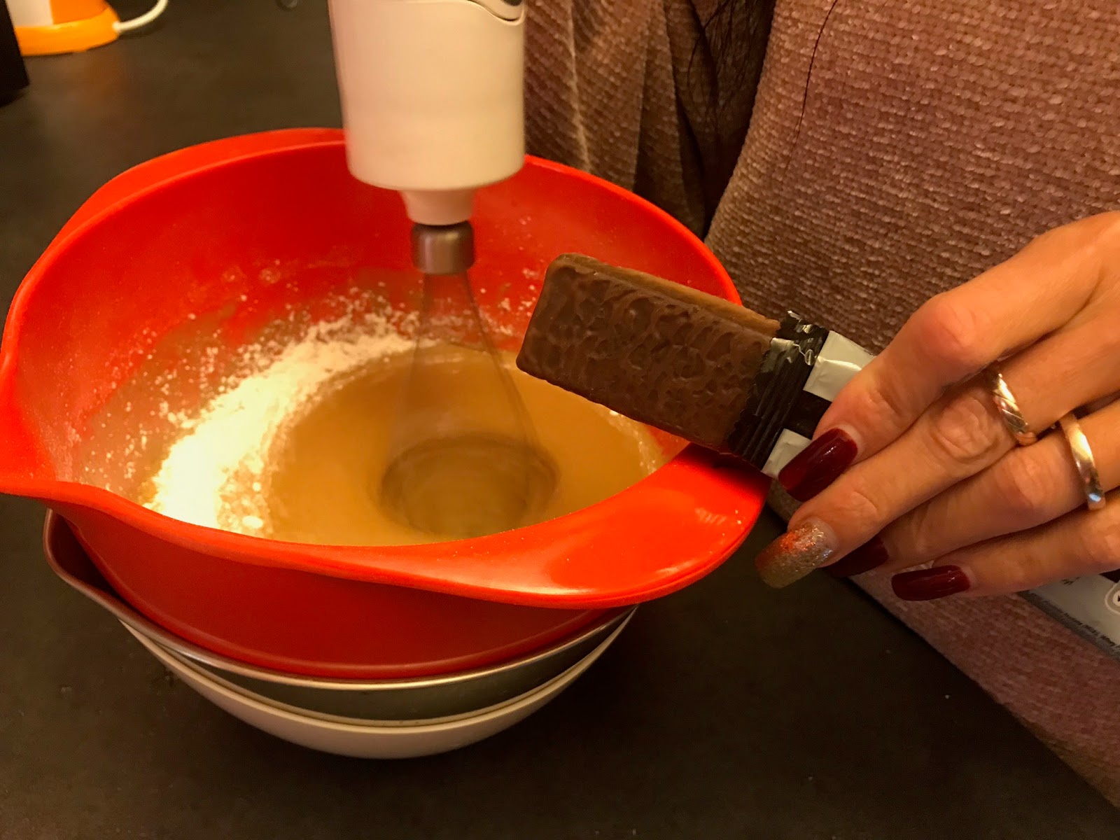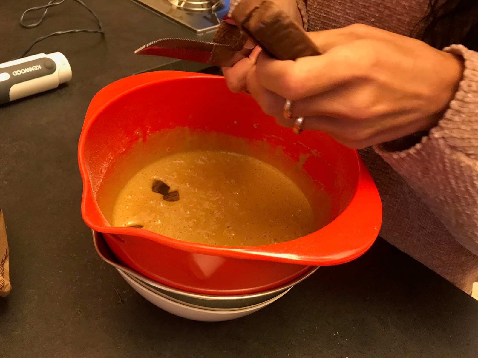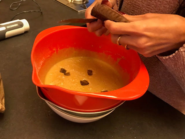 Mescolate con cura, quindi incorporate la farina setacciata (io sono pigra e non l’ho setacciata), il burro fuso ancora caldo e per ultimo il lievito, un pizzico di sale.
