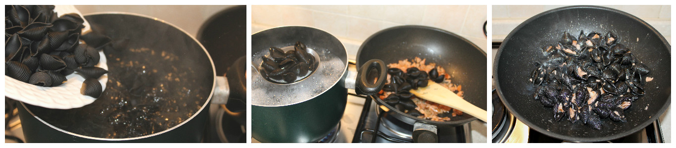 Tuffate le conchiglie nell’acqua che bolle e cuocetela per il tempo indicato sulla confezione. Scolate la pasta con una schiumarola e versatela direttamente nella padella con il condimento. Non vi preoccupate se rimane un po’ di acqua di cottura all’interno delle conchiglie, servirà a mantecare il tutto, mentre fate saltare la pasta con la salsa. Mescolate bene facendo saltare il tutto a fiamma vivace per un paio di minuti.