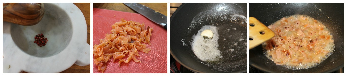 Preparate la pentola per la cottura della pasta con abbondante acqua e sale, mettene di meno rispetto alle vostre abitudini per sia il condimento che la pasta sono già molto sapidi. Pestate il pepe rosa fino a sminuzzarlo fine. Io utilizzo il mortaio ma andrà bene anche un batticarne. Sminuzzate il salmone con il coltello e accendete il fuoco sotto alla pentola per la pasta. Mentre l’acqua raggiunge il bollore Sciogliete il burro nella saltapasta, aggiungete il salmone, una spolverata di pepe rosa e sfumate con il whisky. Cuocete a fiamma vivace per 3 minuti e poi togliete dal fuoco.
