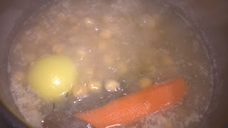 In questo primo utilizzerò i ceci: quando li cucino, li preparo in quantità abbondante in modo da ritrovarli pronti all’occorrenza. Dopo averli tenuti in ammollo per 24 ore, li faccio lessare mettendo nell’acqua di cottura alloro, carota, cipolla e rosmarino.