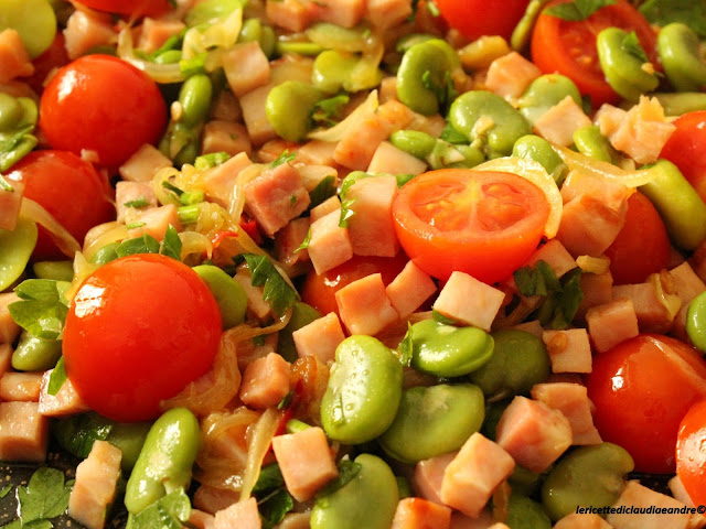 - Unire anche i pomodori, le fave sgusciate, il prezzemolo lavato e tagliato molto fine e proseguire con la cottura per circa 10 minuti, insaporendo di sale e pepe.