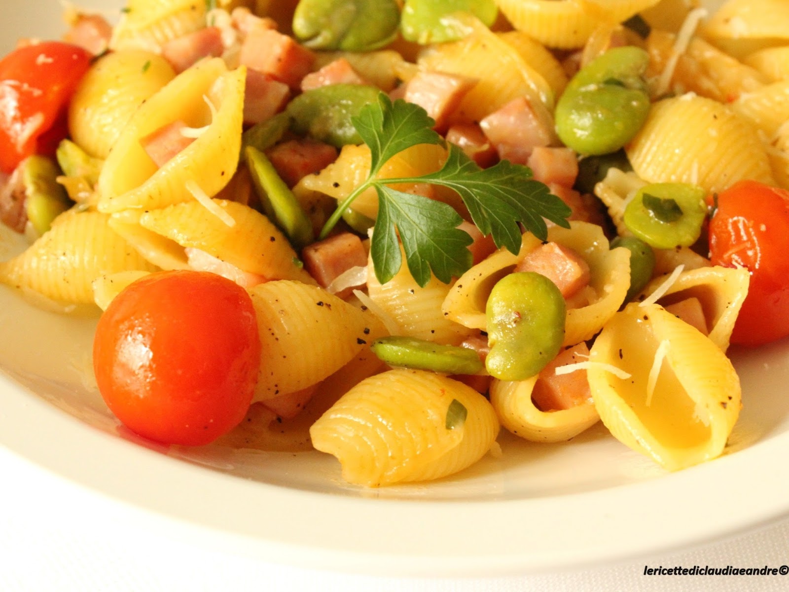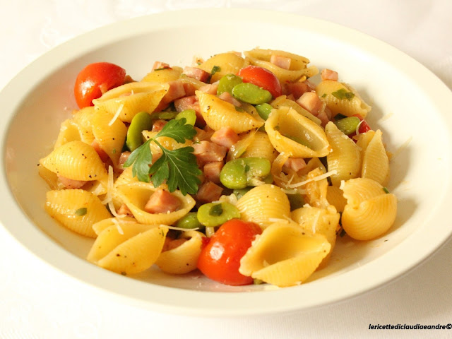 Conchiglie di pasta con fave, prosciutto e pomodorini