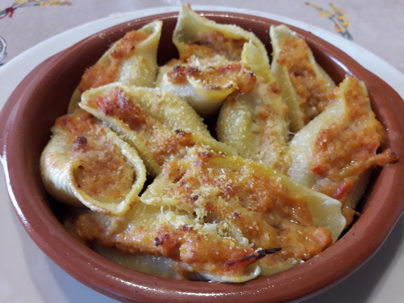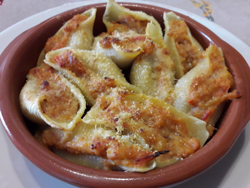 Ungere di olio 4 pirofiline o cocottine di terracotta. Farcire ogni conchiglione con un bel cucchiaino di ripieno e allinearli nelle tegliette, ben ravvicinati. Cospargerli con un pizzico di pangrattato e di parmigiano, un filo d’olio e gratinarli sotto il grill del forno per una decina di minuti.