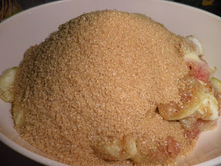 Li ho sbucciati e fatti a pezzi; in 1 chilogrammo di frutta ho aggiunto 500 g di zucchero di canna.