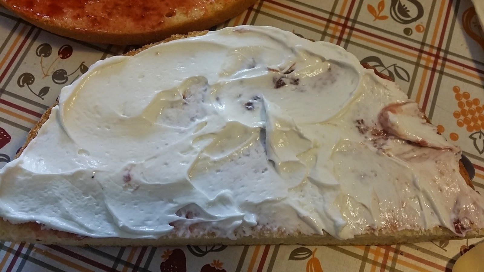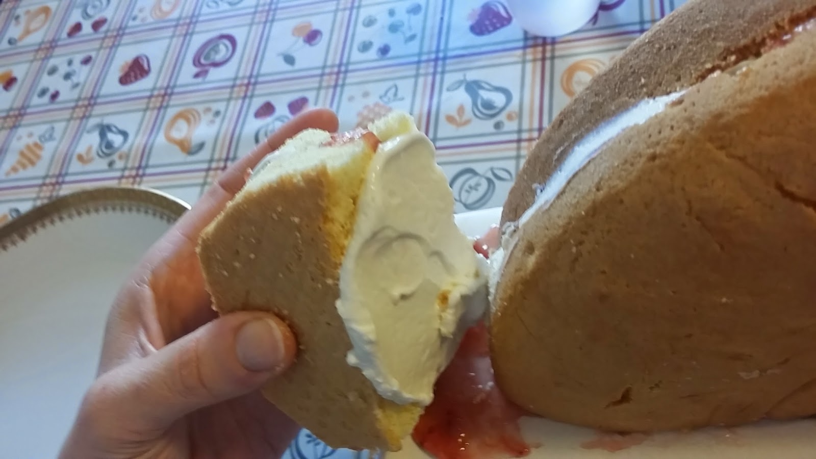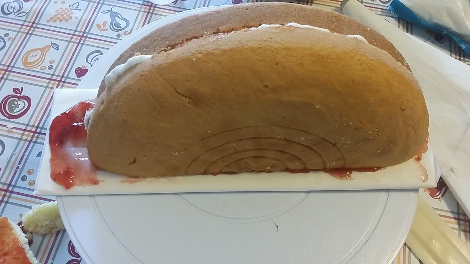 Per prima cosa tagliatela longitudinalmente, per facilitarvi il compito infilate uno stecco da spiedino all’interno e con un coltello a lunga lama seghettata, tipo da pane, tagliate la torta a metà restando paralleli allo stecchino, così riuscirete ad ottenere due metà dallo spessore uguale.