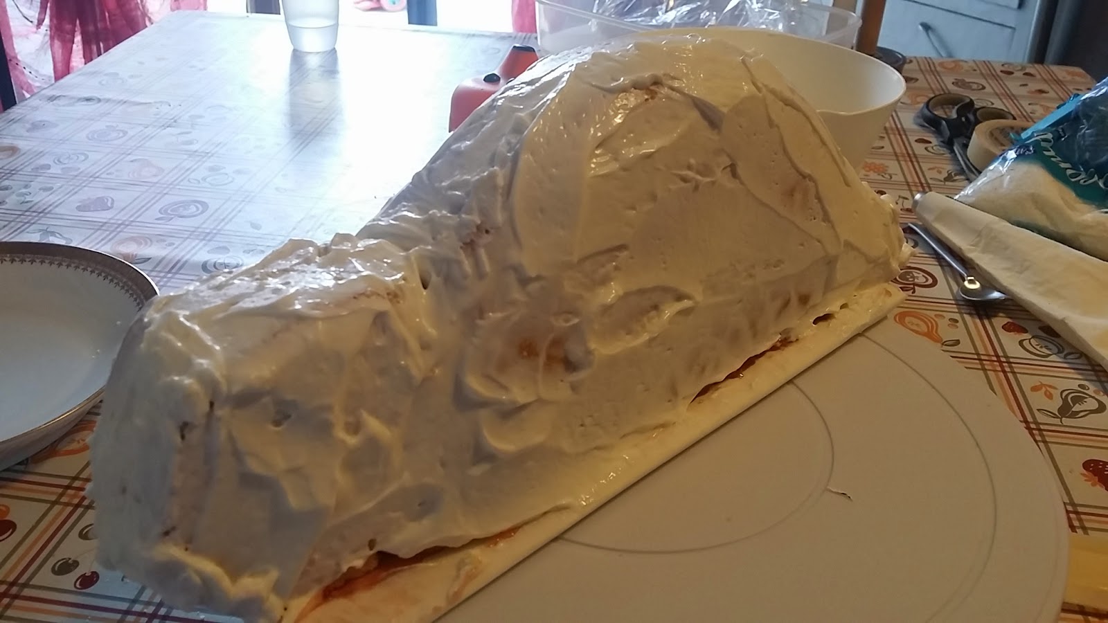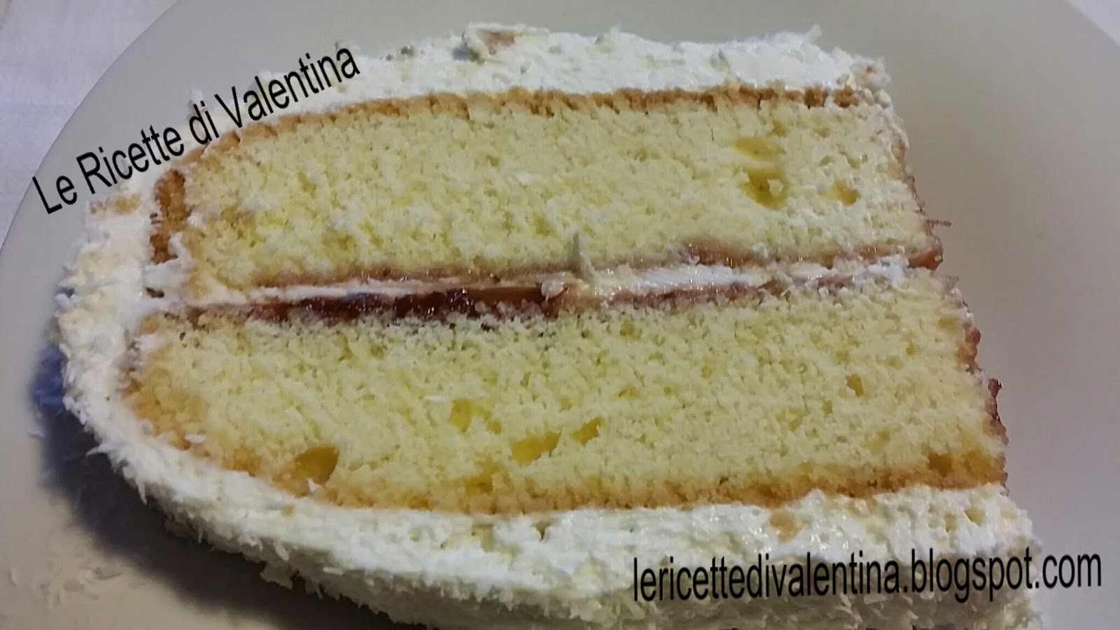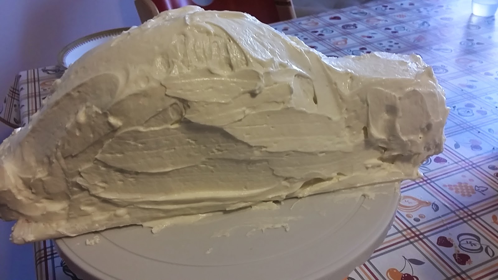 Adesso la parte divertente che però sporca un po’. Prendete delle manciate di cocco grattugiato e ricoprite tutta la crema, per fare bene i fianchi dovrete gettarlo a manciate, un po’ come si fa con il riso agli sposi! IL cocco che in eccesso potrete recuperarlo tranquillamente!