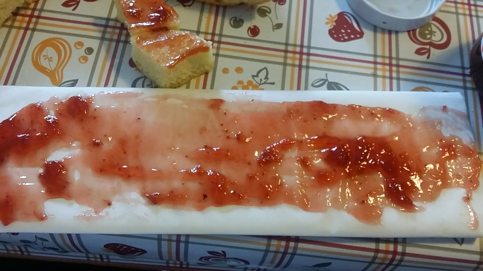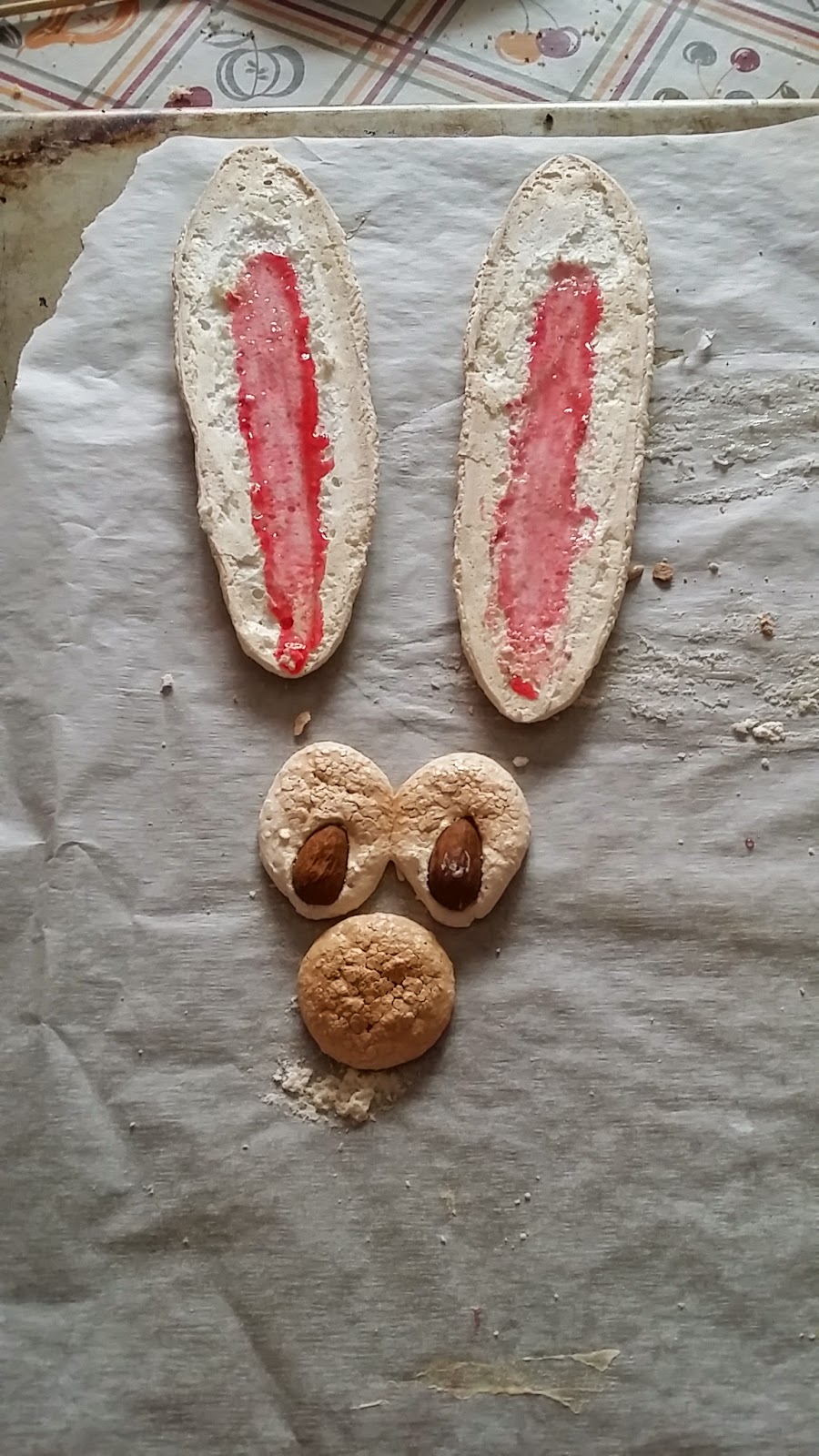 Nel frattempo prendete il corpo, la testa e la coda del coniglio, aprite tutti i pezzi in 2 metà e spalmate su di ognuna un velo di marmellata di fragole.