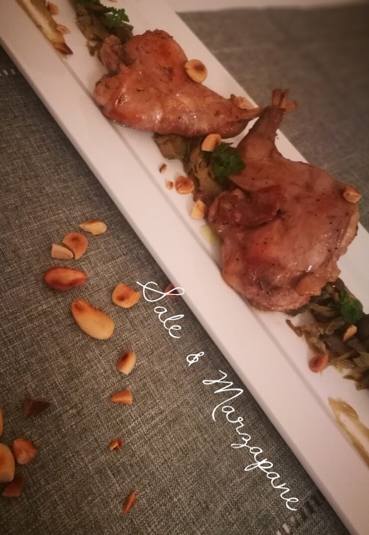 A parte tostate le mandorle dopo averle tritate grossolanamente. Servire il coniglio ed i carciofi ben caldi. Buon appetito.