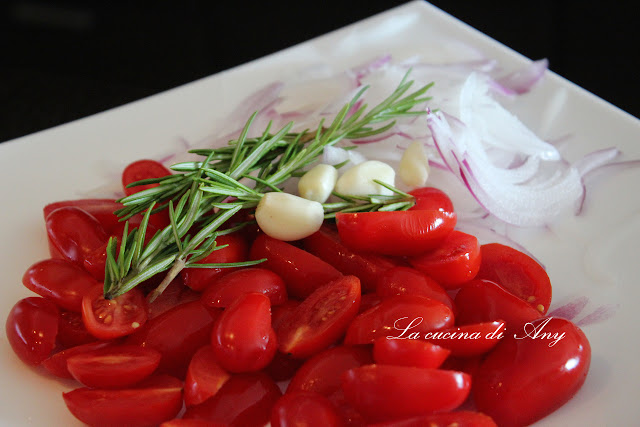 Aggiungere i pomodorini tagliati a metà, le cipolle tagliate a julienne, i spicchi d’aglio interi e i rametti di rosmarino.