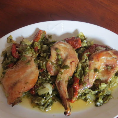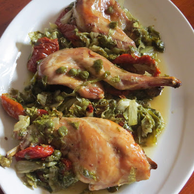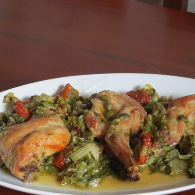La carne di coniglio è una delle carni più prelibate e delicate, molto magra ma nello stesso tempo tenera e succosa, oggi è stata cucinata in modo particolare, utilizzando dei pomodori secchi sott’olio, capperi e insalata indivia riccia, quindi passata al forno per la cottura, un appetitoso secondo piatto di carne bianca…..