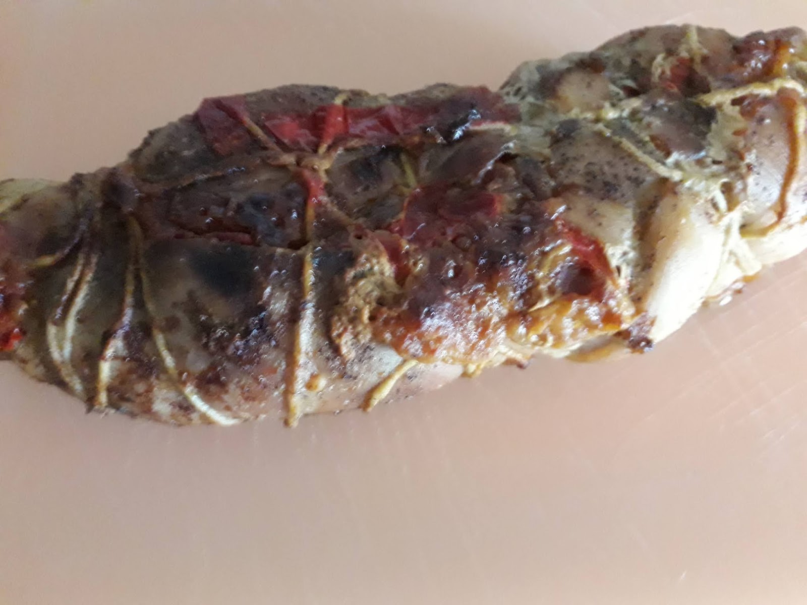 Dopo aver disossato il coniglio,ormai aperto, farciamo con fette di porchetta,peperoni in padella,