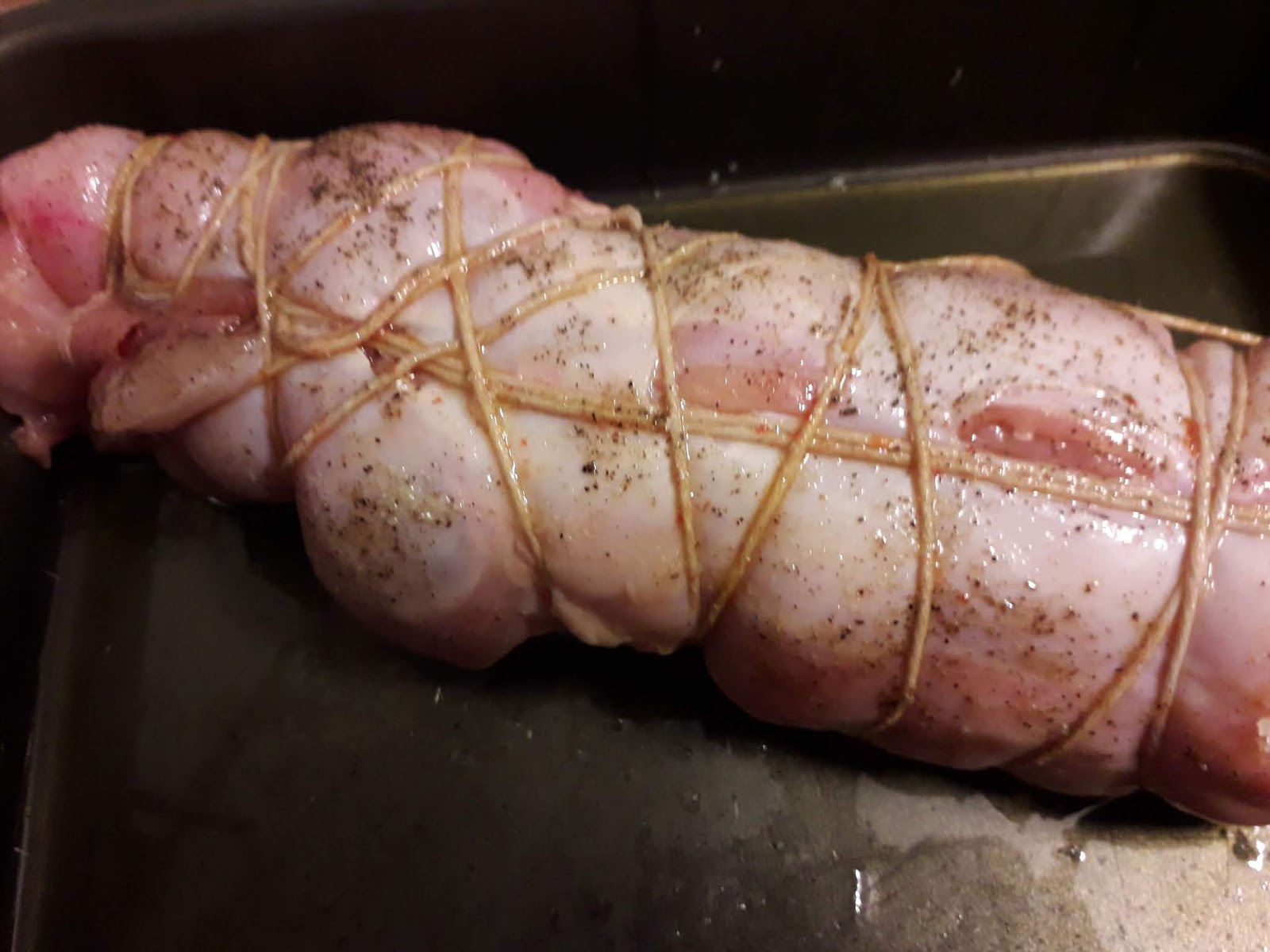 (ogni tanto andremo a rigirare) poi eliminiamo la carta e lasciamo rosolare ancora una decina di minuti. Spegnamo e lasciamo intiepidire per poterlo slegare ,tagliamo poi a fette e serviamo