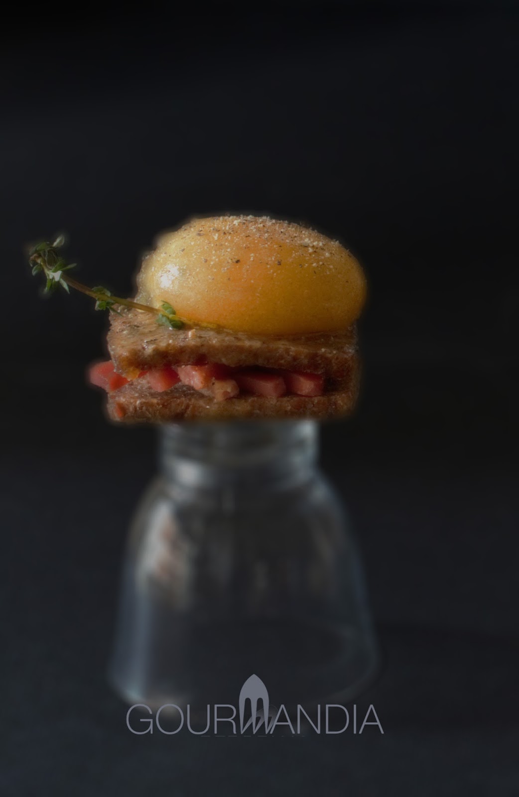 Toast con prosciutto infornato e sfera di diospero vaniglia