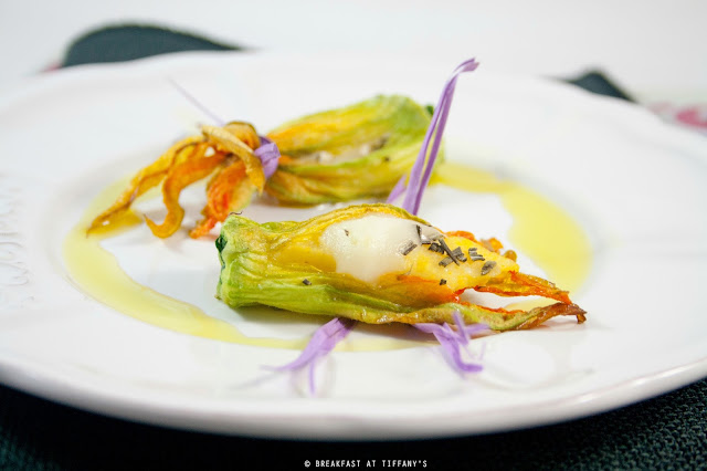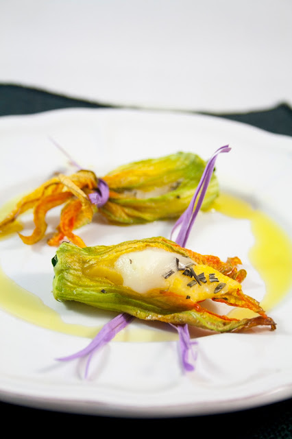 Sistemare i fiori di zucca in una pirofila oliata rivestita di carta forno e mettere in forno caldo a 180°C per circa 15 minuti o fino a quando la caciotta inizierà a sciogliersi.