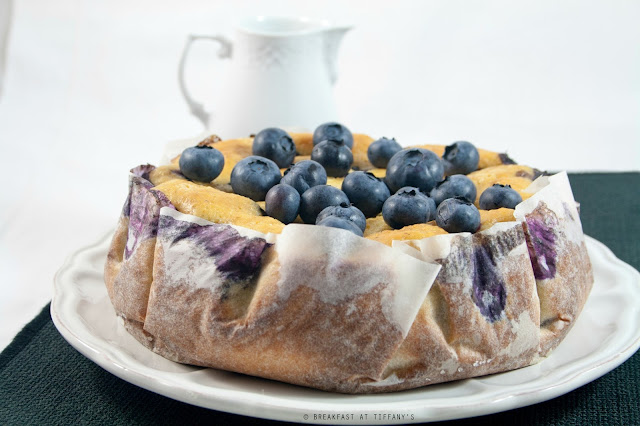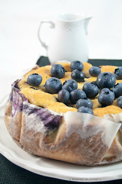 Versare l’impasto nella tortiera rivestita di carta forno, aggiungere i mirtilli in modo sparso e mettere in forno per circa 30 minuti.