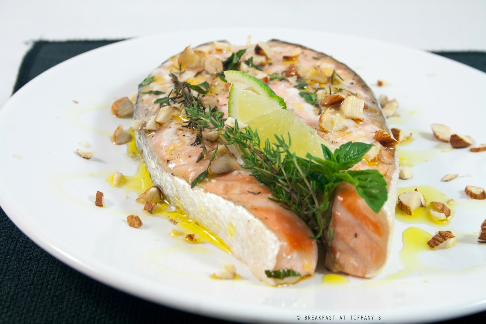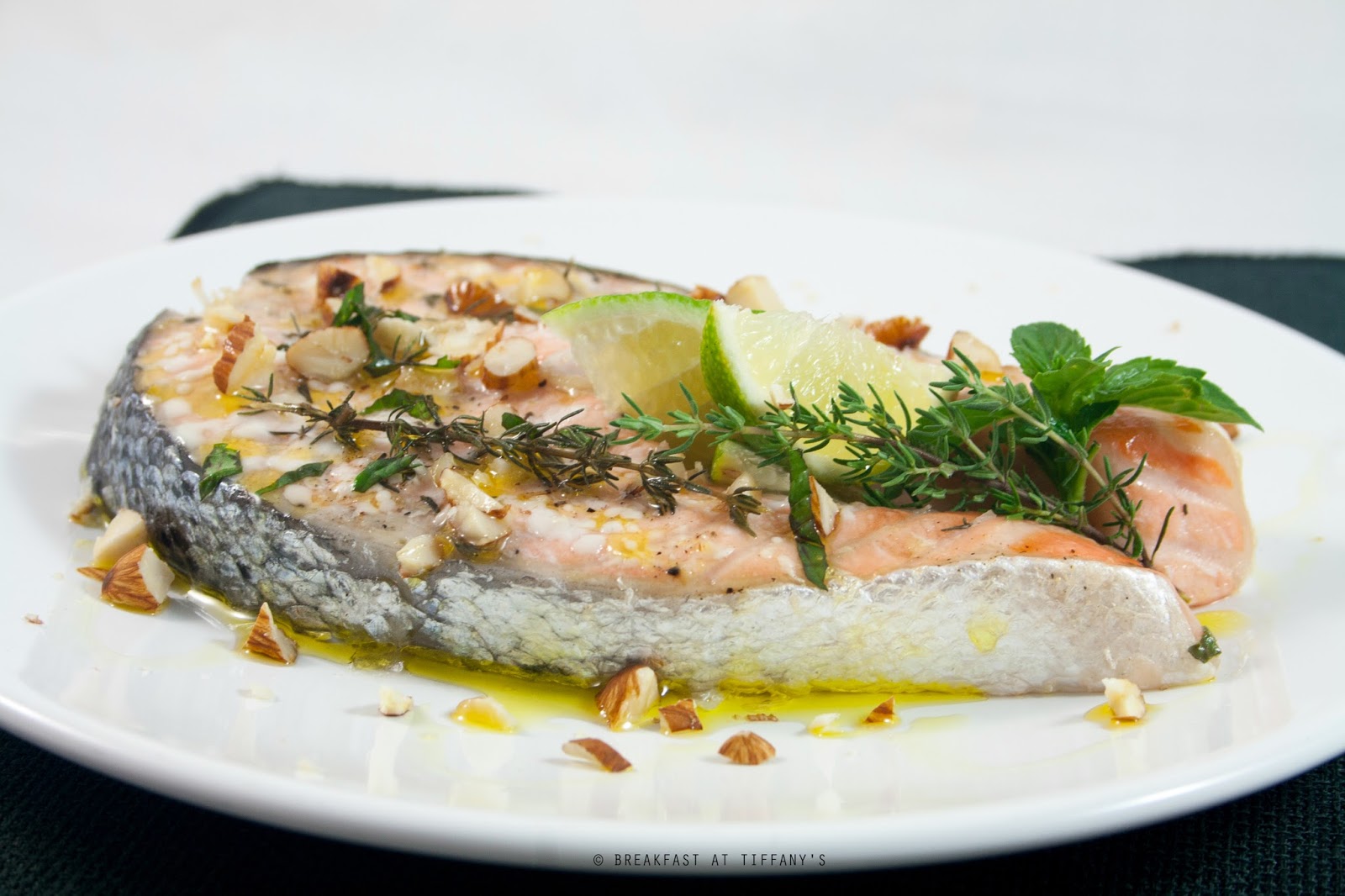 Trascorso il tempo per la marinatura, trasferire il salmone sulla teglia del forno rivestita di carta da forno, irrorarli leggermente con dell’olio extravergine di oliva e cospargerli di mandorle ridotte a pezzi e del timo tritato.