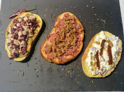 1° crostino: avanzo di petto di tacchino al marsala con olive nere, peperoncino e paté di olive verdi