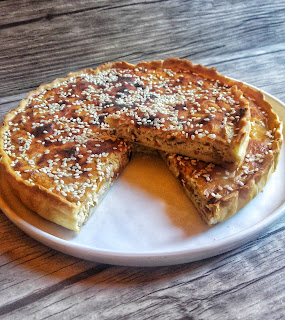 Mescolare uovo, ventresca, alici, formaggio e le cipolle, farcire la pasta brisé, mettere in forno statico a 200° per i primi 20 minuti coperta da carta stagnola e per altri 20 minuti senza, sfornare, lasciar raffreddare e cospargere di sesamo.