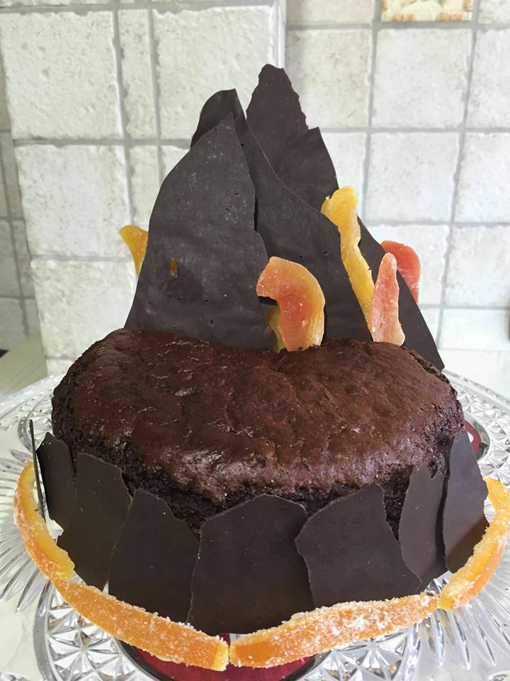 Torta al cioccolato: 200gr zucchero canna 200 gr farina 75 gr cacao amaro 250 gr latte riso 1 bustina lievito. Farcita con marmellata di albicocche fatta in casa. Decorata con sfoglie di cioccolato fondente, mango e papaia essiccate e scorze d’arancia candite!