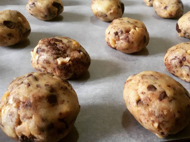 Pizzicate dall’impasto un po’ di composto e con i palmi delle mani formate delle palline grosse poco più di una noce e adagiatele in una teglia foderata di carta forno,