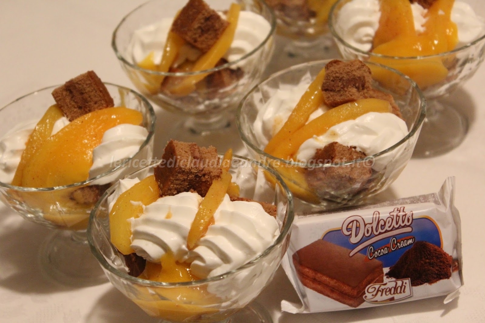 Prendere 7 coppette e distribuire in ognuna una merendina tagliata in 8 pezzi, lasciandone un pezzettino da parte per decorare sopra. Dividere la coulis di cachi sopra, decorare con la panna montata, con delle fettine di cachi caramellati e i pezzettini di merendina lasciati da parte. Se ce l’avete, decorate anche con qualche fogliolina di menta. Io mi sono trovata sprovvista e al dire che per me, senza una fogliolina di menta, sembra una coppetta preparata solo a metà , ma l’abbiamo mangiata comunque di gusto dopo aver finito la cena ! Buona in ogni occasione, in quanto veloce da fare e anche molto golosa !