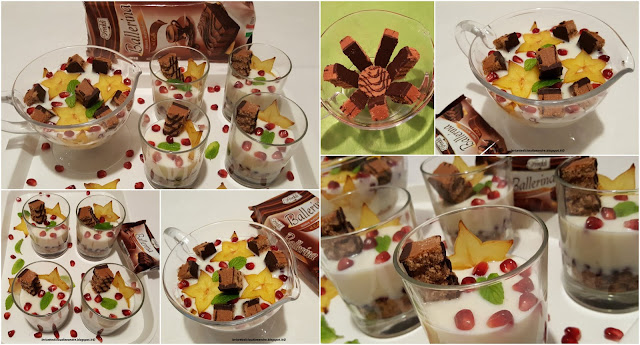 - Decorare con un pezzo di merendina, una fetta di carambola, chicchi di melograno e foglia di menta.