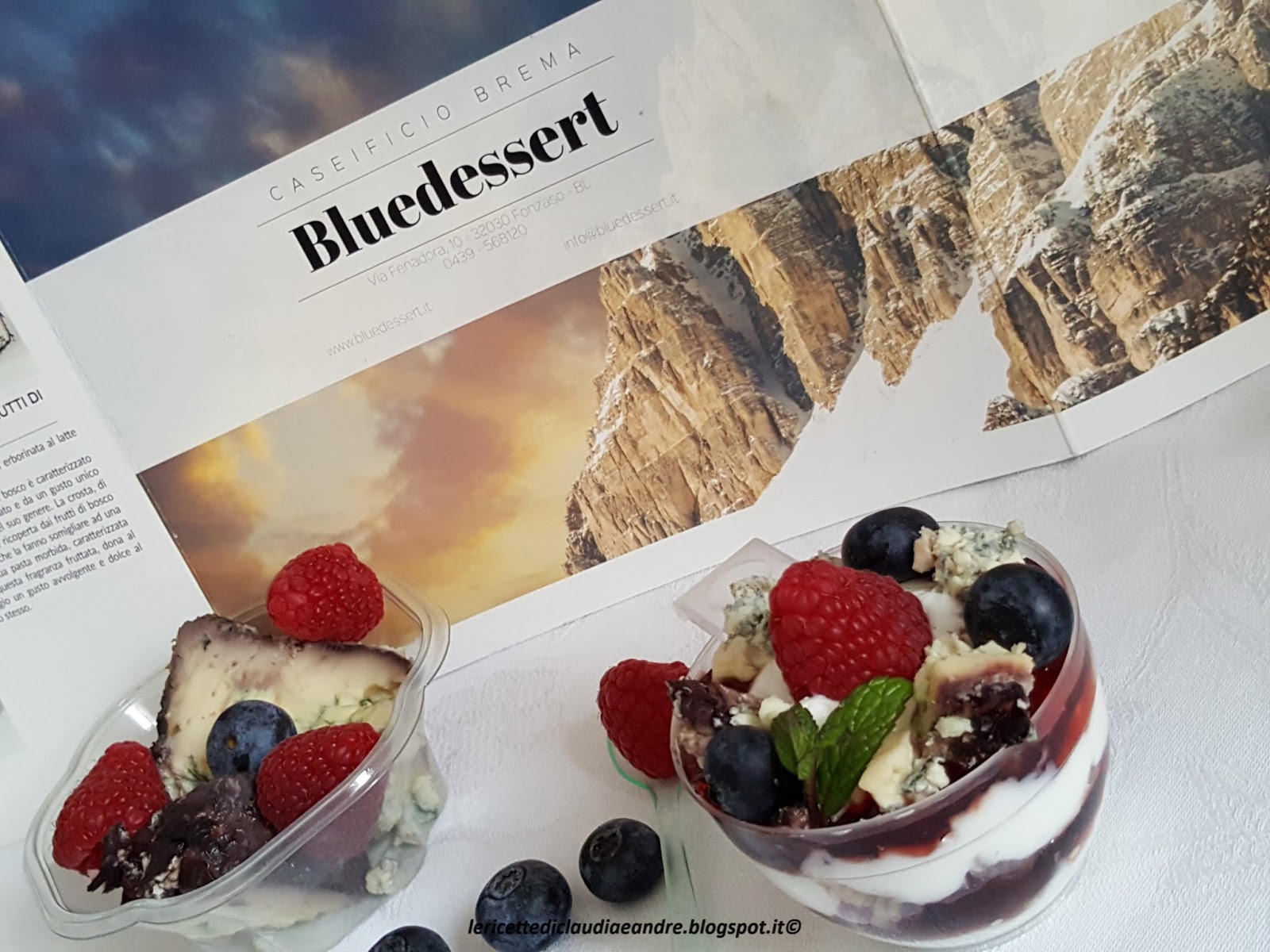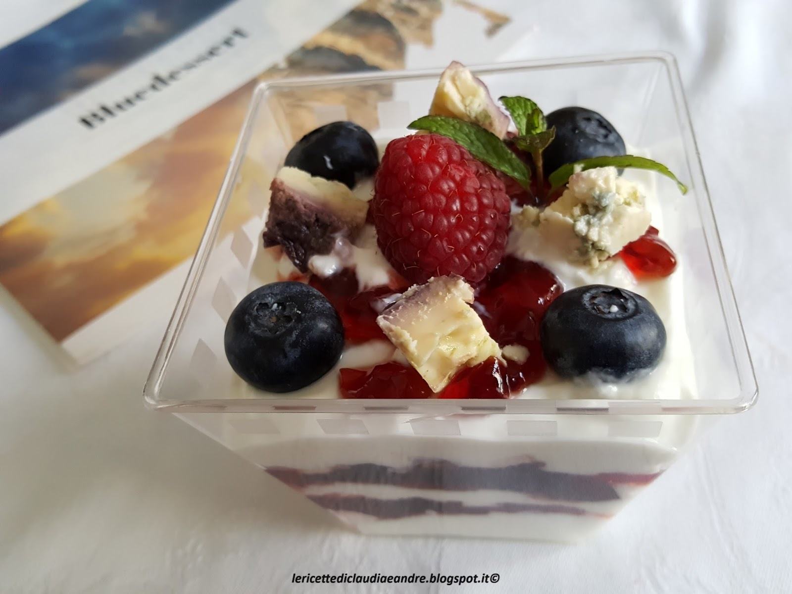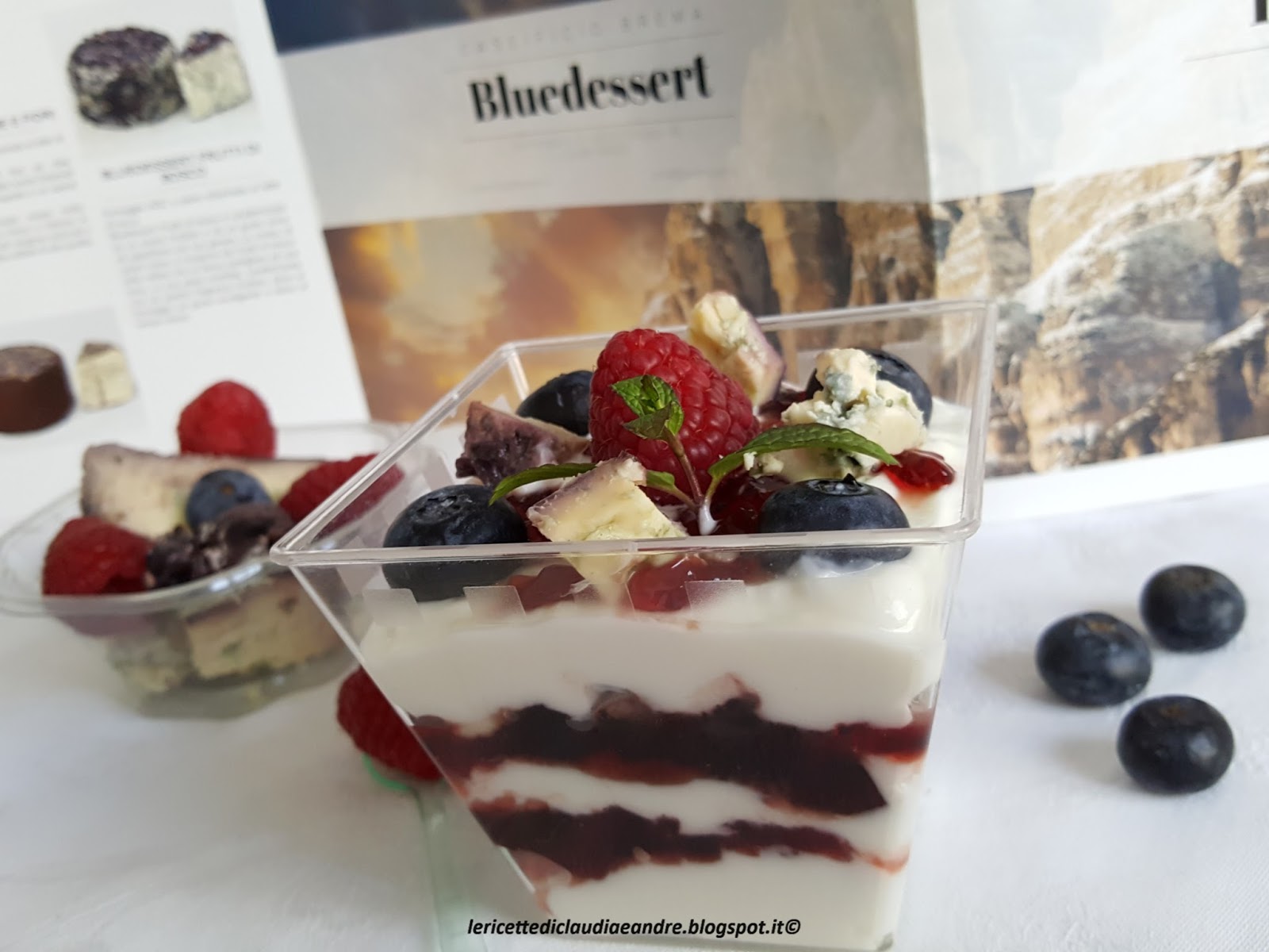 Queste golose e gustose coppette preparate con strati alterni di yogurt greco, gelatina di mirtilli nel mio caso, ma si può usare anche una confettura ai frutti di bosco, formaggio Bluedessert ai Frutti di bosco del Caseificio Brema e con una decorazione di misto di frutti di bosco freschi ha conquistato a pieno la mia famiglia. Si preparano in tempo molto veloce, le quantità sono a piacere, perciò, se volete stupire i vostri famigliari o dei ospiti, vi li consiglio vivamente. Sono ottime sia come antipasto per un buffet o festicciola, o per una merenda nutriente. Il formaggio Bluedessert Frutti di bosco erborinato e fatto con latte di vacca ed è caratterizzato da un’aroma fruttato e da un gusto unico ed appetitoso nel suo genere. La crosta, di colore roseo, è ricoperta dai frutti di bosco della vallata, la fanno somigliare ad una torta.