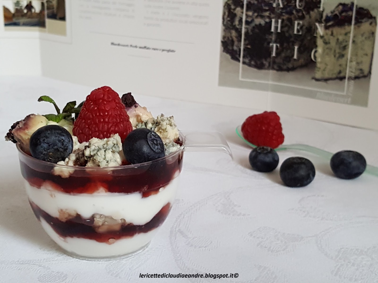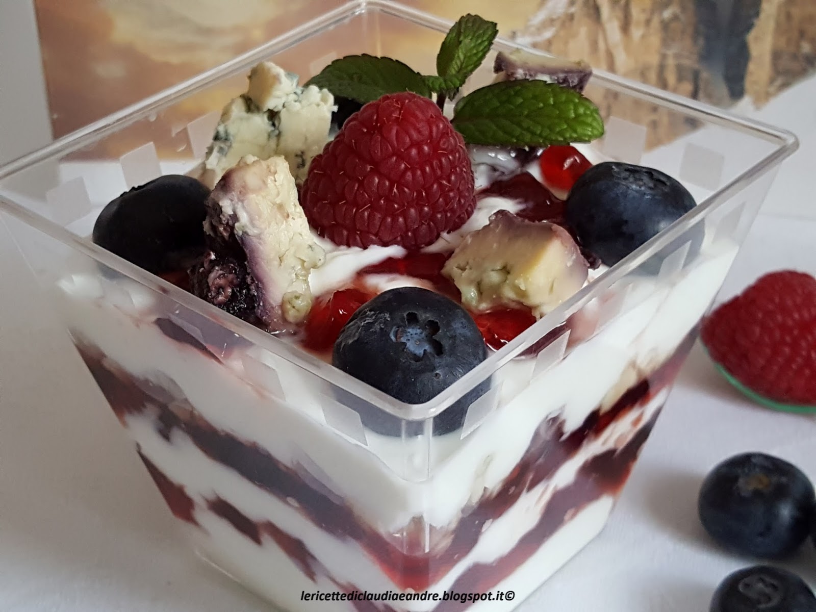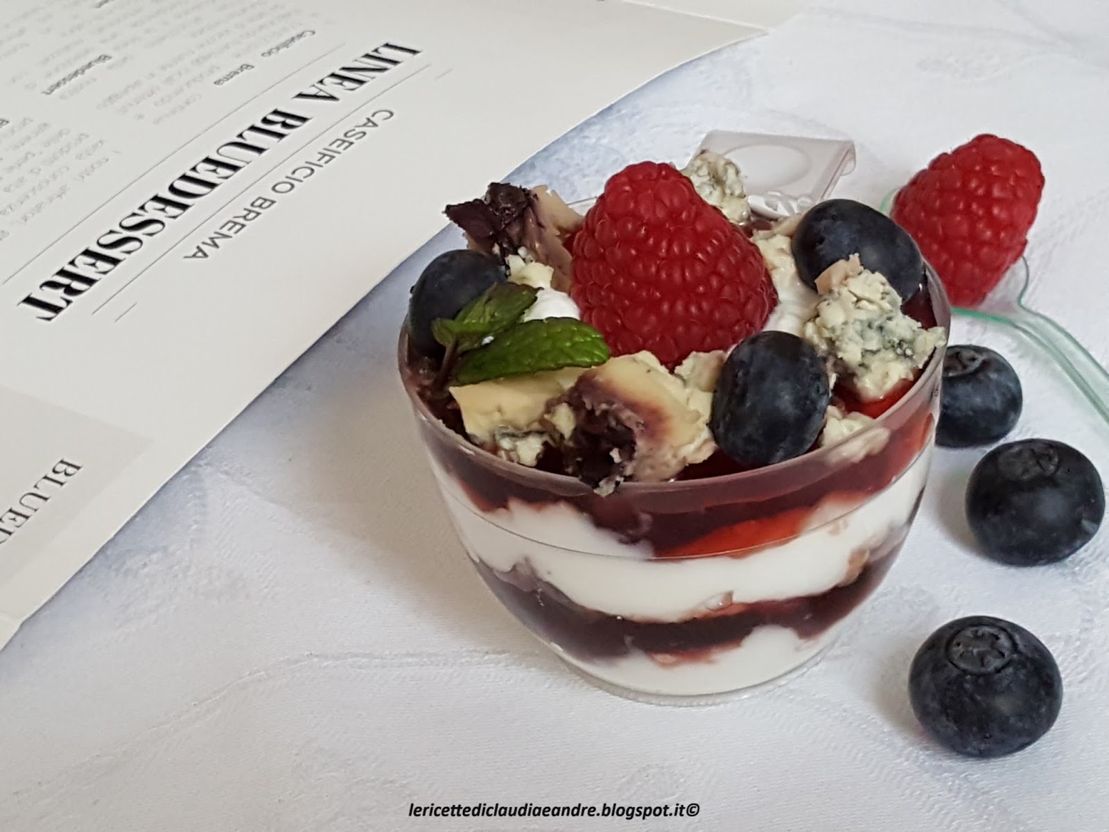 Queste golose e gustose coppette preparate con strati alterni di yogurt greco, gelatina di mirtilli nel mio caso, ma si può usare anche una confettura ai frutti di bosco, formaggio Bluedessert ai Frutti di bosco del Caseificio Brema e con una decorazione di misto di frutti di bosco freschi ha conquistato a pieno la mia famiglia. Si preparano in tempo molto veloce, le quantità sono a piacere, perciò, se volete stupire i vostri famigliari o dei ospiti, vi li consiglio vivamente. Sono ottime sia come antipasto per un buffet o festicciola, o per una merenda nutriente. Il formaggio Bluedessert Frutti di bosco erborinato e fatto con latte di vacca ed è caratterizzato da un’aroma fruttato e da un gusto unico ed appetitoso nel suo genere. La crosta, di colore roseo, è ricoperta dai frutti di bosco della vallata, la fanno somigliare ad una torta.