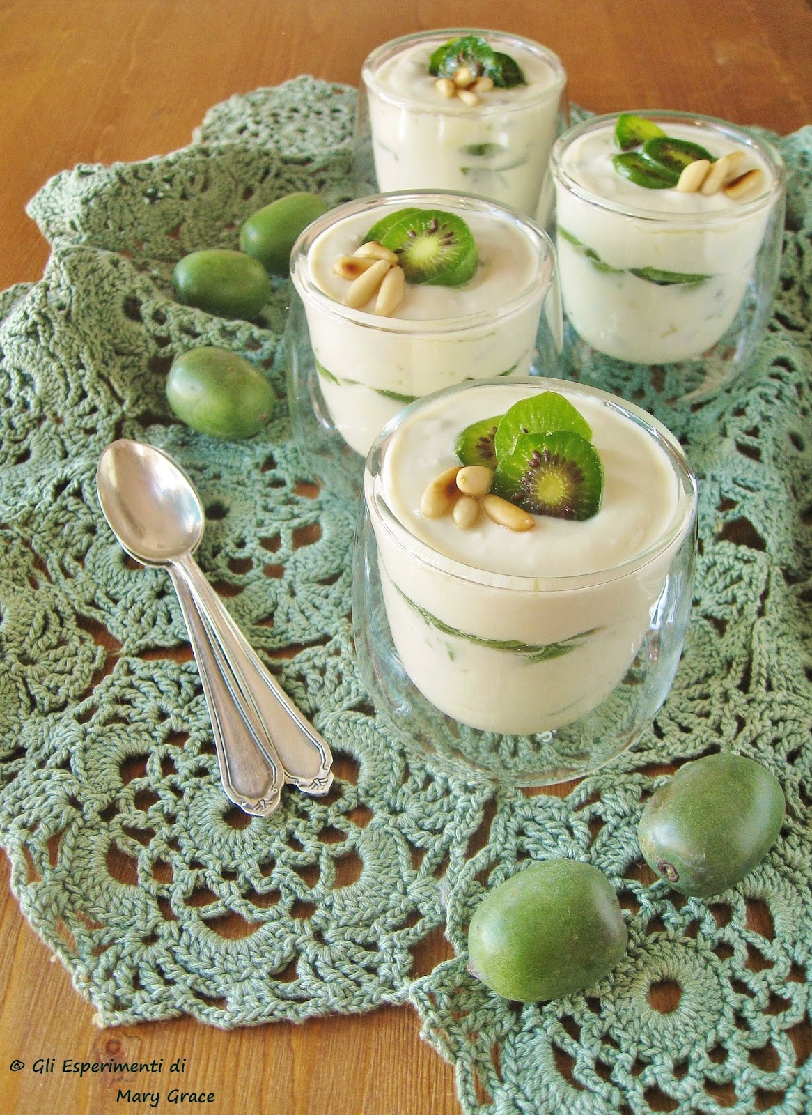 Con parte della crema riempire a metà quattro piccole coppe, appoggiare su questo primo strato le fettine di Nergi rimaste e coprire con un altro strato di crema. Decorare con qualche fettina di Baby Kiwi e pinoli tostati.