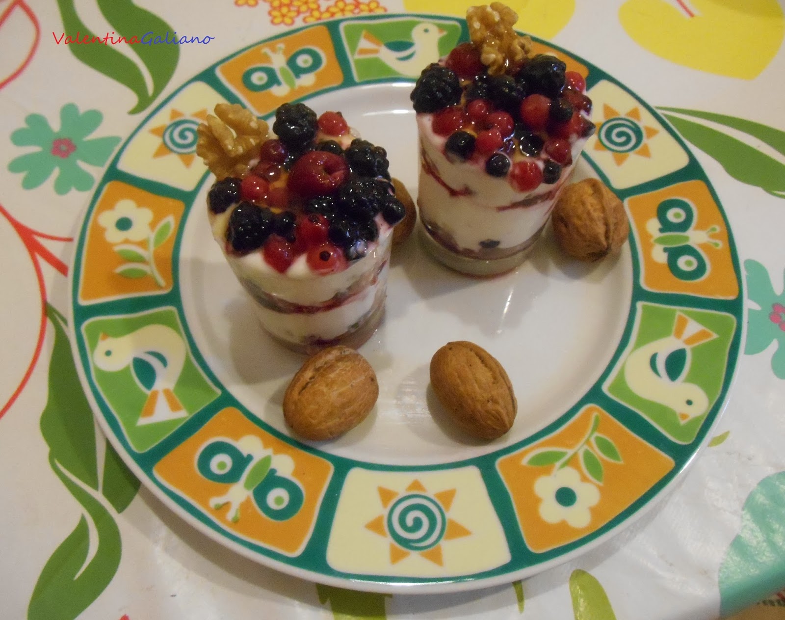 Versatene un cucchiaio nella coppettina. Sgusciate le noci. Riducetene una a pezzetti e spolverizzateli nella coppetta coi frutti. Ricoprite con un cucchiaio di yogurt ben freddo. Ripetete il procedimento a ricreare un altro strato uguale. L’ultimo strato in alto dovrà essere di yogurt. Decoratene la sommità con i frutti di bosco, mezzo gheriglio di noce e fatevi cadere a colata il miele di Acacia, che luciderà i frutti. Buona colazione o merenda a tutti!