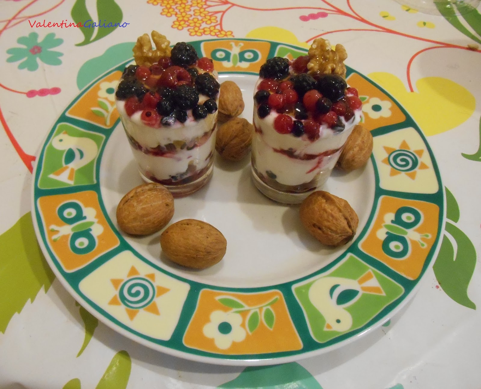 Versatene un cucchiaio nella coppettina. Sgusciate le noci. Riducetene una a pezzetti e spolverizzateli nella coppetta coi frutti. Ricoprite con un cucchiaio di yogurt ben freddo. Ripetete il procedimento a ricreare un altro strato uguale. L’ultimo strato in alto dovrà essere di yogurt. Decoratene la sommità con i frutti di bosco, mezzo gheriglio di noce e fatevi cadere a colata il miele di Acacia, che luciderà i frutti. Buona colazione o merenda a tutti!