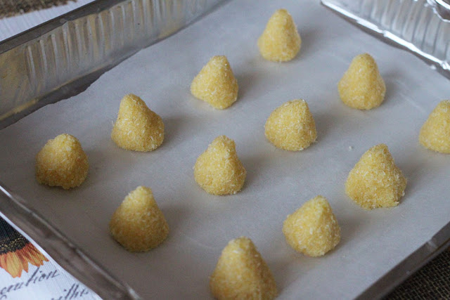 Foderate con della carta da forno una teglia. Poi formate 12 palline, quindi schiacciatele leggermente sulla punta: dovranno avere un aspetto a cono, è la loro caratteristica. Potete anche cuocere i dolcetti direttamente nei pirottini.