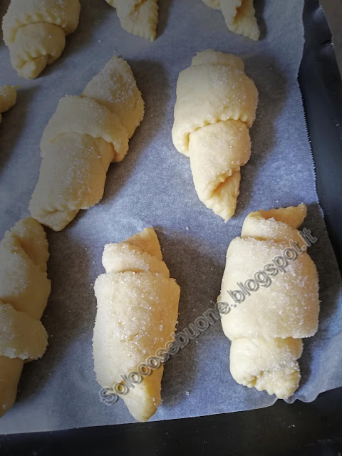 Prima di infornarli a 170° per 15 minuti, pennelliamoli delicatamente con un po’ di acqua e copriamo con zucchero semplice o in granella.