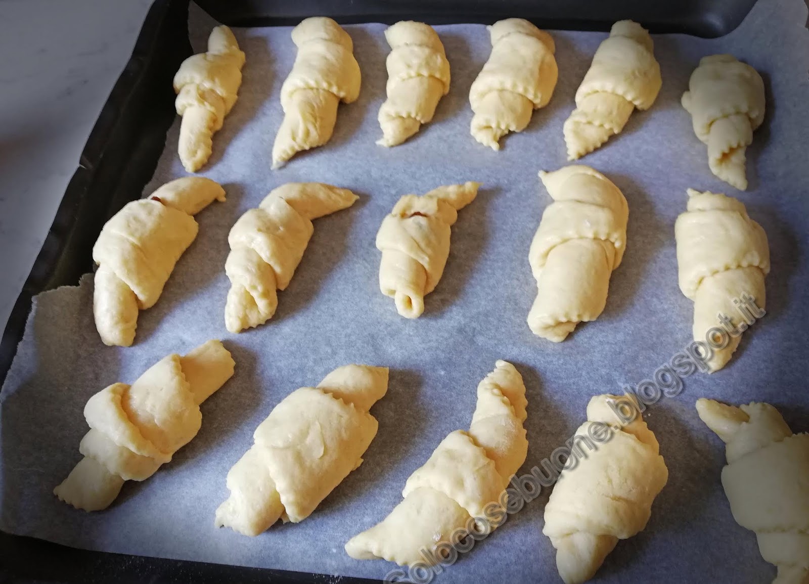 Disponiamo i cornetti su una teglia coperta da carta forno e mettiamoli a lievitare di nuovo fino al raddoppio (ci vorranno altre 2 / 3 ore)
