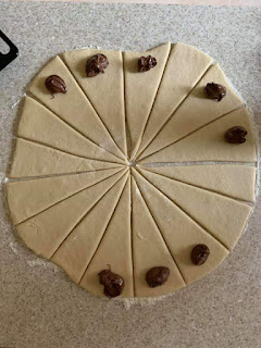 Stendete l’impasto con il mattarello e formate un cerchio, ricavate 16 triangoli, tagliate aiutandovi con una rotella. Farciteli a piacimento, io nutella.