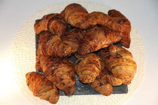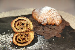 Se volete fare le veneziane, formare delle palline da 60 gr., far lievitare e a lievitazione avvenuta cuocere con crema pasticcera e zucchero in granella.Ore 15.00Fare dei pastelli da circa 1 Kg. Stendere di pastelli su teglie pulite e metterle in frigo a 2-3° per circa 3 ore. Dopo incorporare in ogni pastello 250 gr di burro precedentemente impastato con 40 gr di cacao e 40 gr di panna oppure crema al burro fatta con per ogni 250 gr di burro 80 gr di cioccolato fondente sciolto a 35 gradi.Ore 18.00Quindi dare il primo giro di pieghe a 3 e il secondo a 4. Ad ogni giro lasciar riposare in frigo 15 min io ho tenuto di più. Ore 22.00Stendere allo spessore di 0,5 cm e formare il cornettoOre 23.00 lievitare a temp. di 18-20° fino al raddoppio.Ore 7.00Cottura a 180 gradi 18 minuti per pezzature di 80 gr.