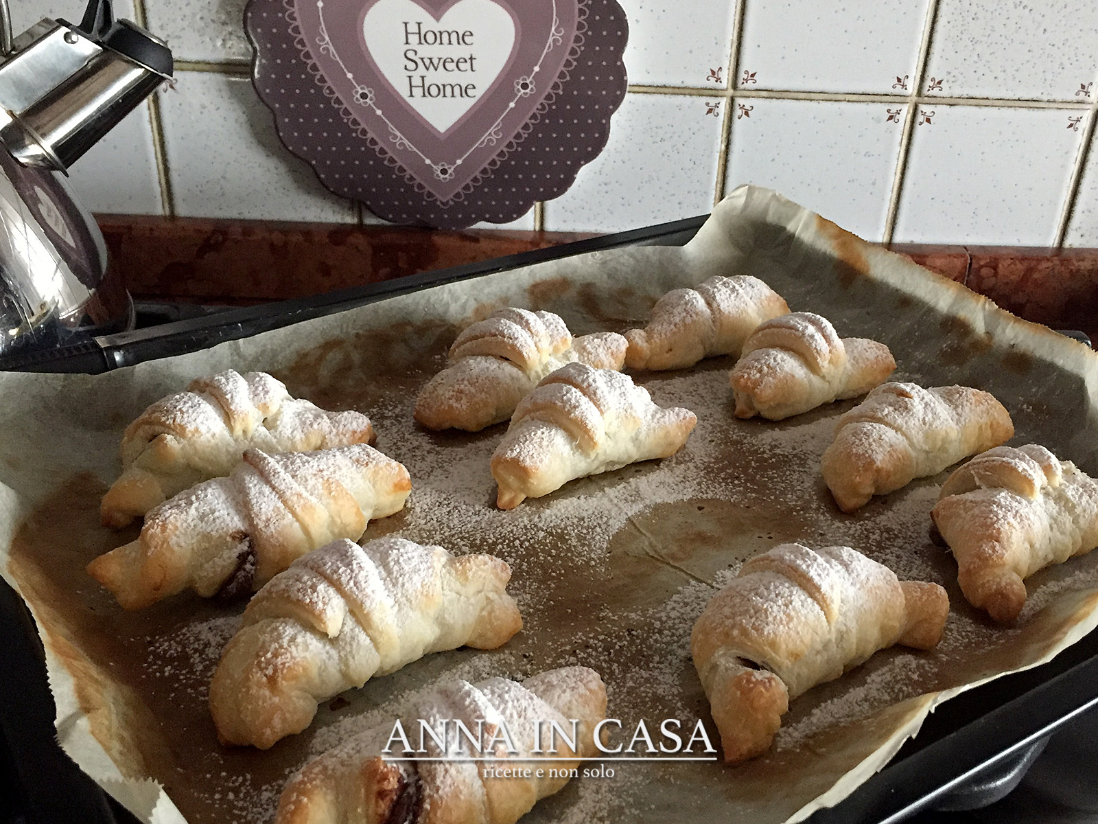 Stendere la sfoglia e tagliare i dischi in 12 spicchi. Farcire gli spicchi con la crema gianduia. Arrotolare gli spicchi senza premere troppo la sfoglia e dare la forma a cornetto.
