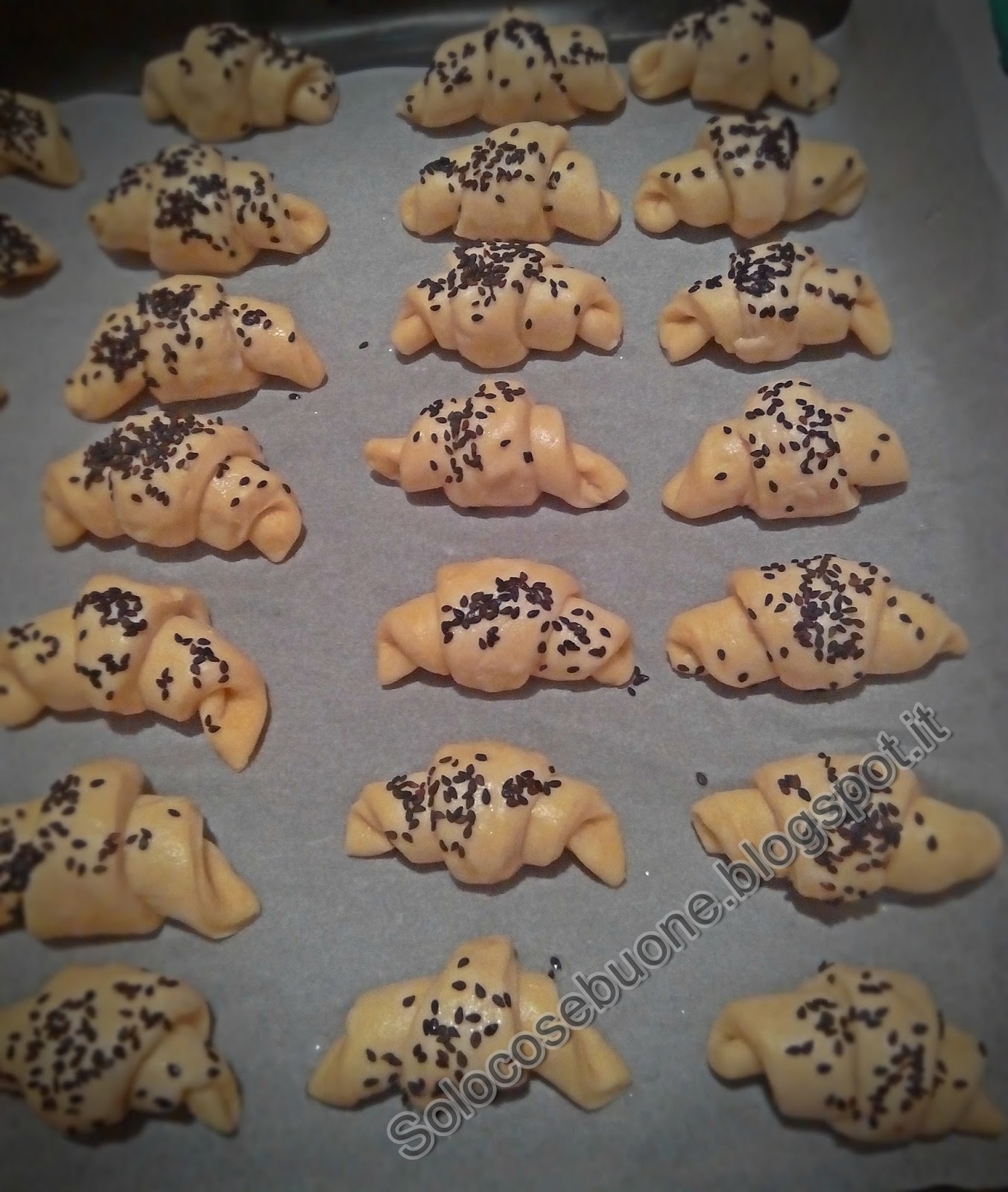 Spennelliamo con delicatezza i cornetti con un po’ di latte o acqua e spolverizziamo con i semi di sesamo . Facciamo lievitare ancora fino al raddoppio.