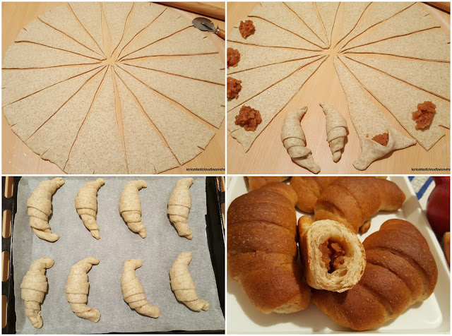 - Arrotolare su se stessi per dare la forma ai cornetti e metterli man mano su una teglia foderata con carta da forno.