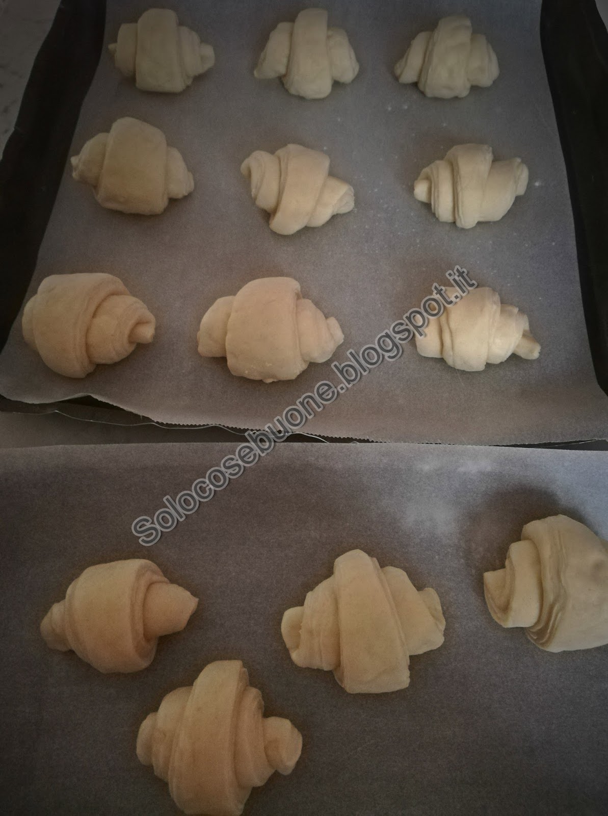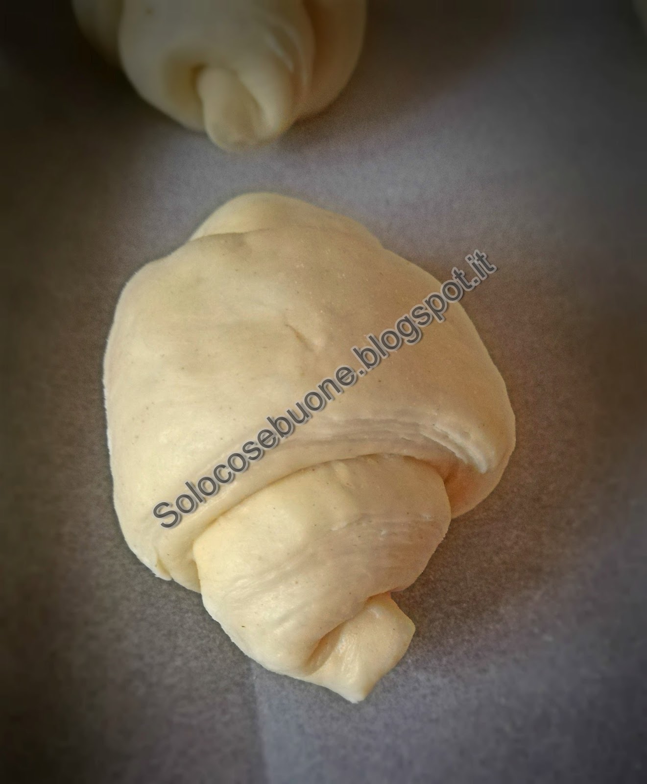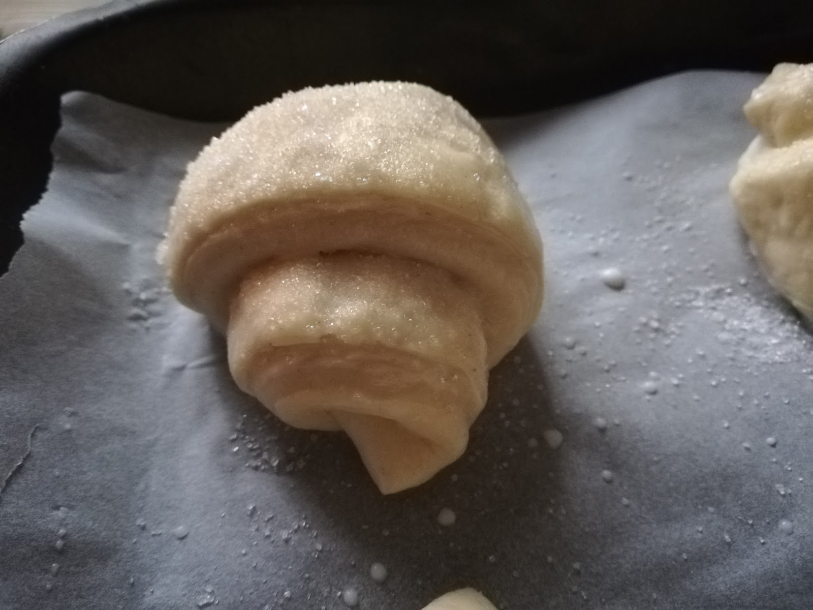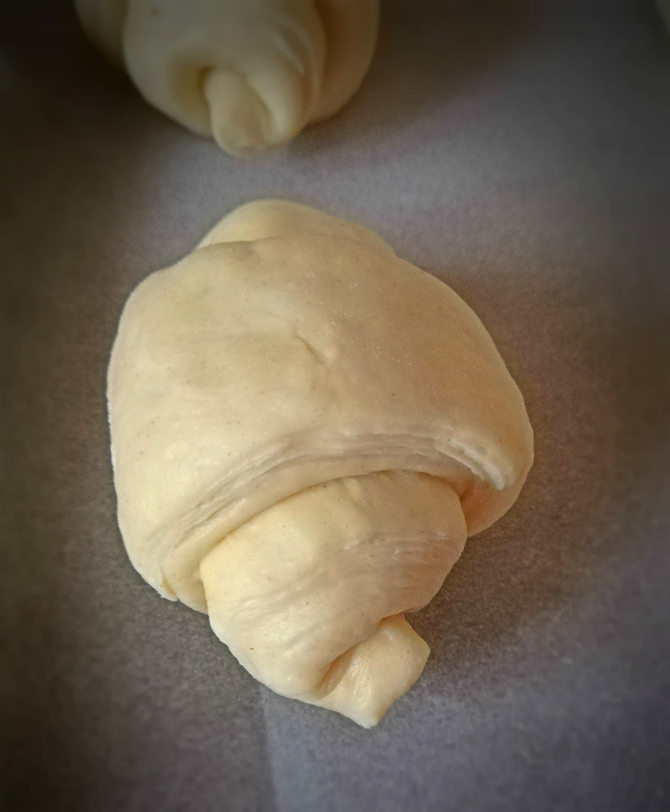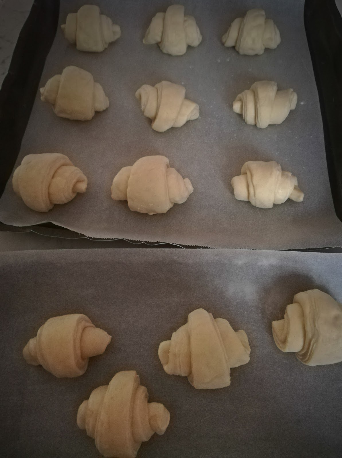 Formare i cornetti sfogliati arrotolando i triangoli su se stessi, e trasferirli, ben distanziati su una teglia foderata con carta da forno, avendo l’accortezza di sistemare la punta di chiusura a contatto con la teglia (affinché non si aprano in fase di lievitazione). Coprire con un panno e lasciarli lievitare in un luogo tiepido e al riparo da correnti d’aria per circa 2 ore.
